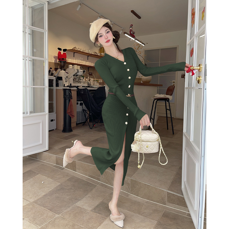 Home > 夜店裙、长袖连衣裙 > FA56299# 针织连衣裙早春美式高级感单排扣V领修身显瘦开叉毛衣长裙子 服裝批發女裝批發服飾貨源