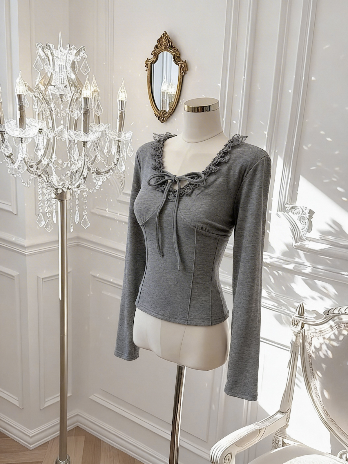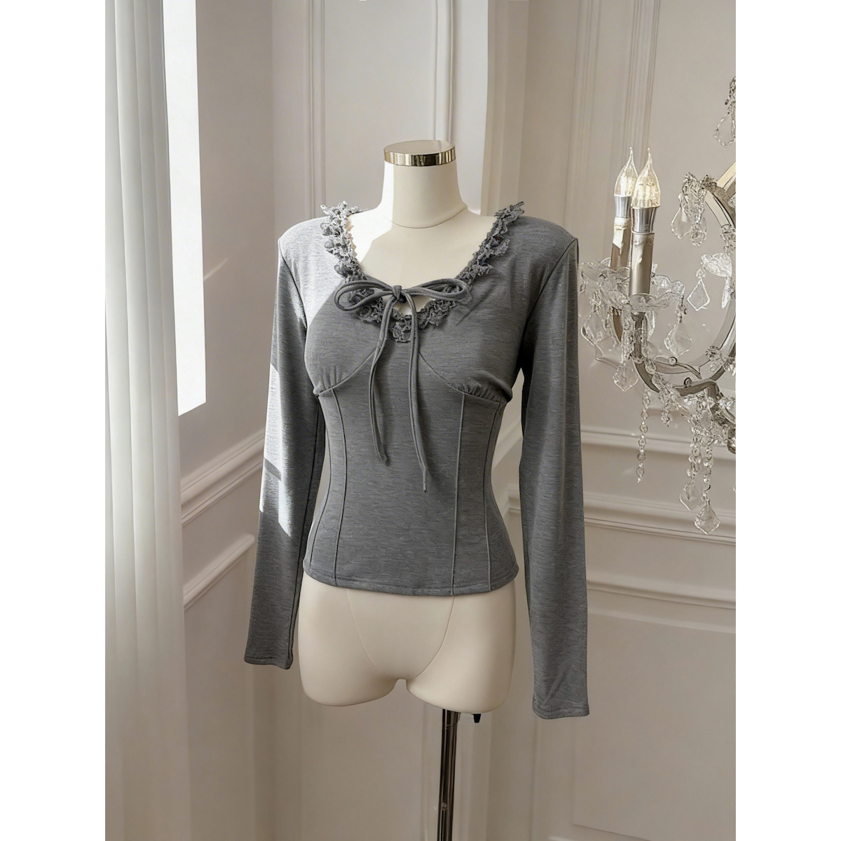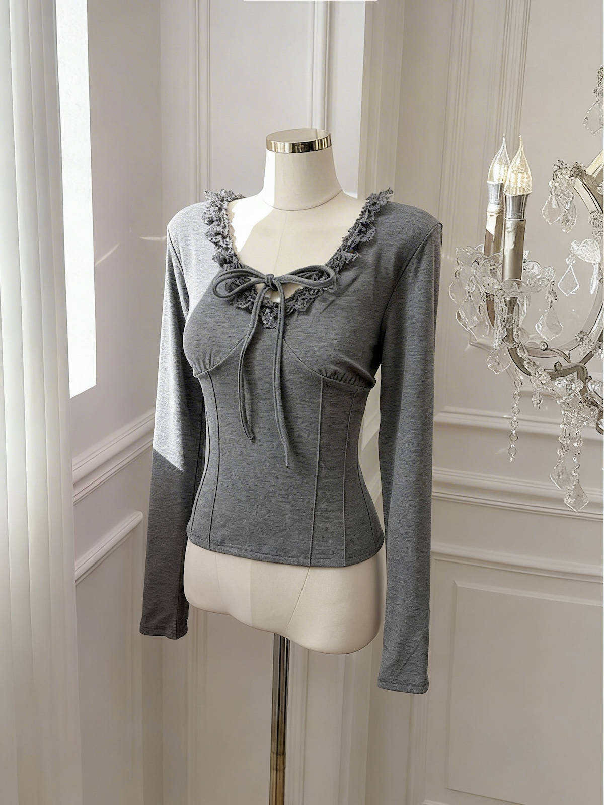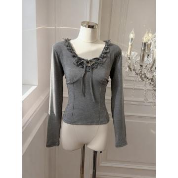 BY10874# 灰色蕾丝花边V领系带T恤女冬季别致修身收腰短款上衣 服裝批發女裝批發服飾貨源