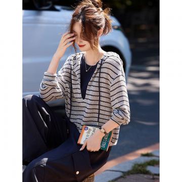 BY11551# 时尚条纹撞色假两件连帽卫衣春季新款针织衫镂空上衣女 服裝批發女裝批發服飾貨源