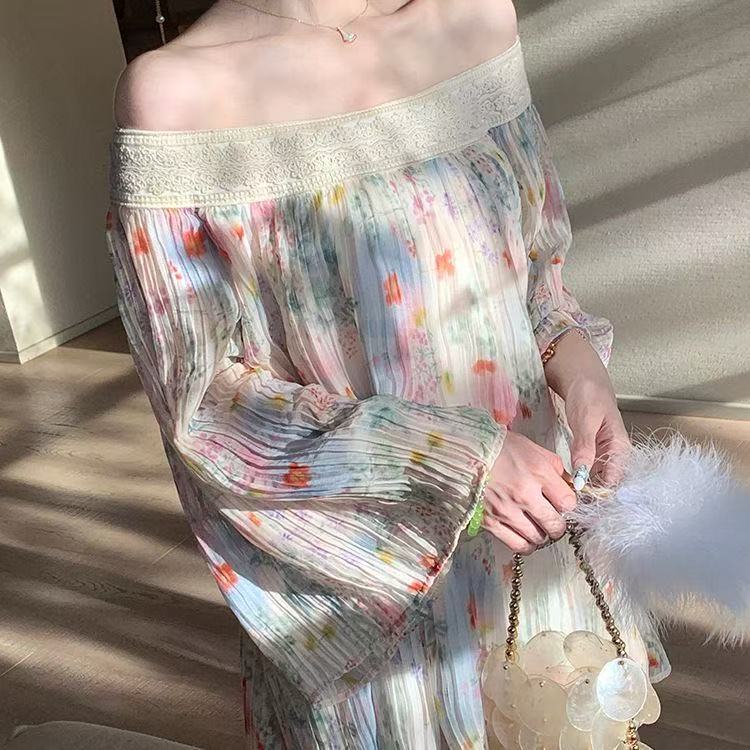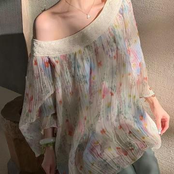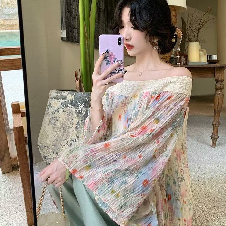 BY11568# 甜美浪漫碎花海边度假一字肩上衣衬衫新款宽松减龄法式雪纺衫 服裝批發女裝批發服飾貨源