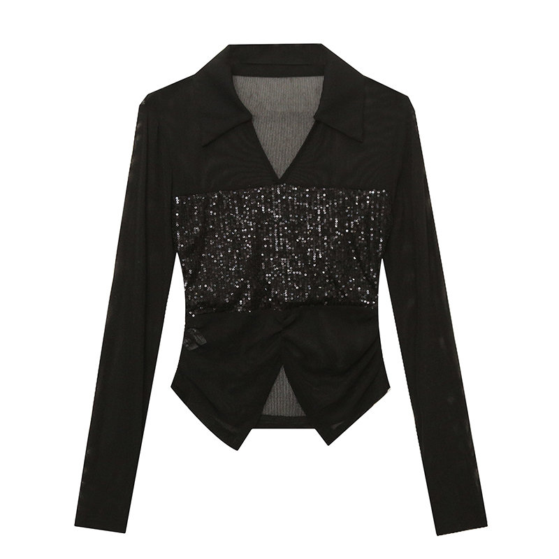 BY11573# 春夏新款微透冰丝网纱拼接亮片v领时尚洋气修身显瘦上衣 服裝批發女裝批發服飾貨源