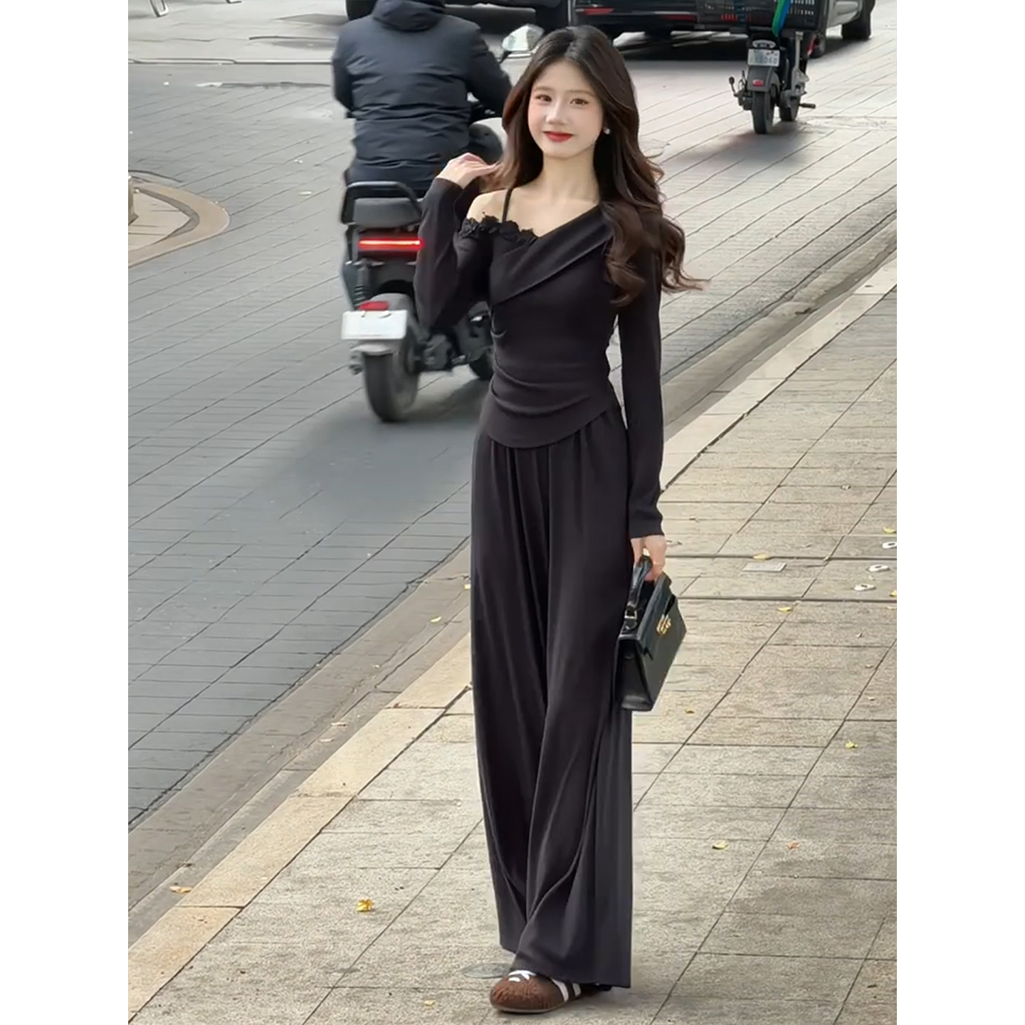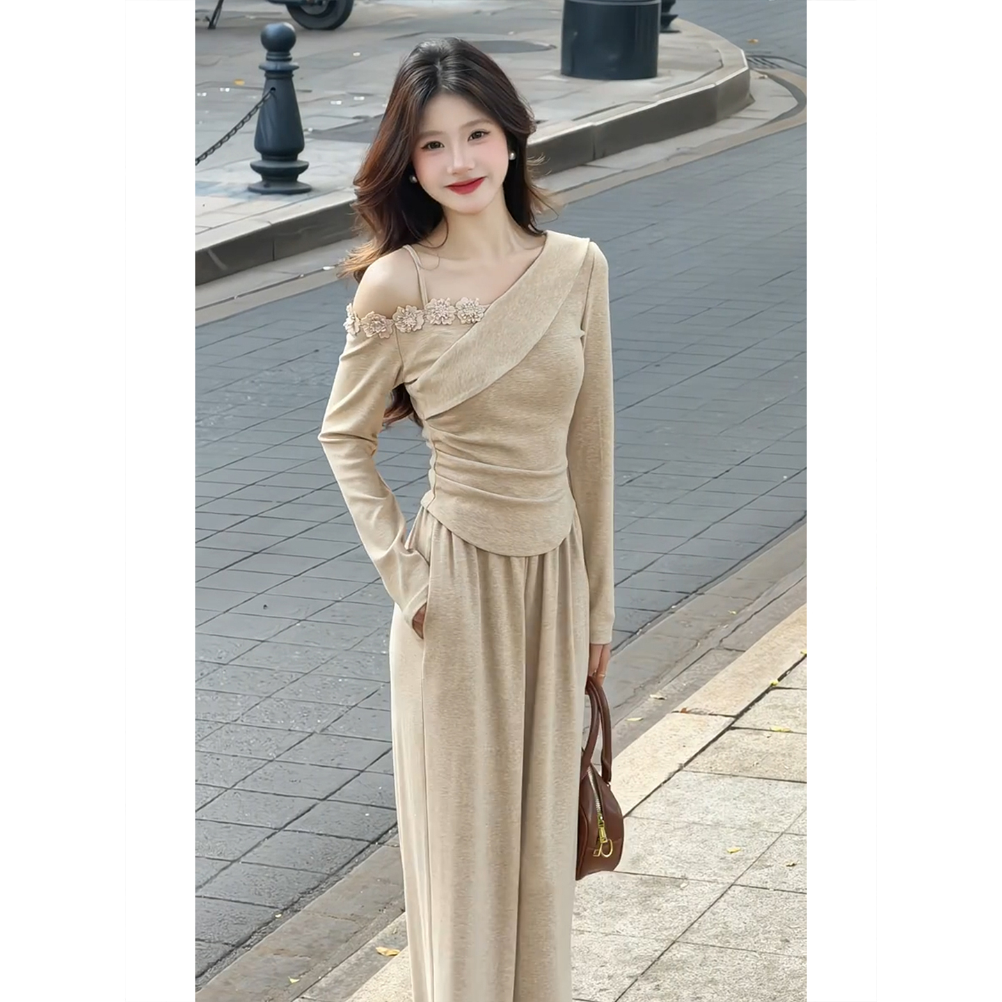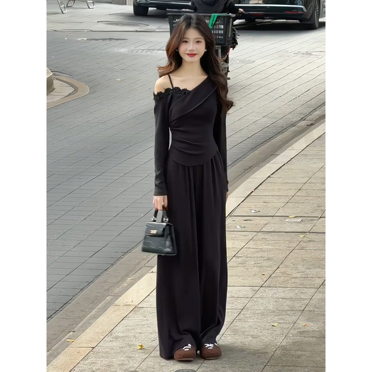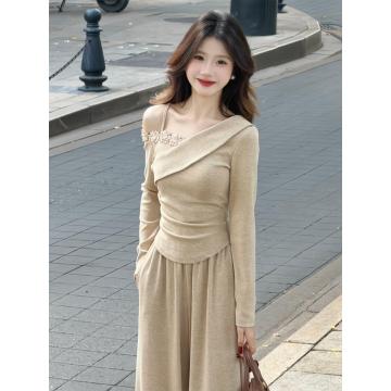 BY11604# 韩系巨好看穿搭一整套早春新款长袖露肩t恤女阔腿裤两件套装 服裝批發女裝批發服飾貨源