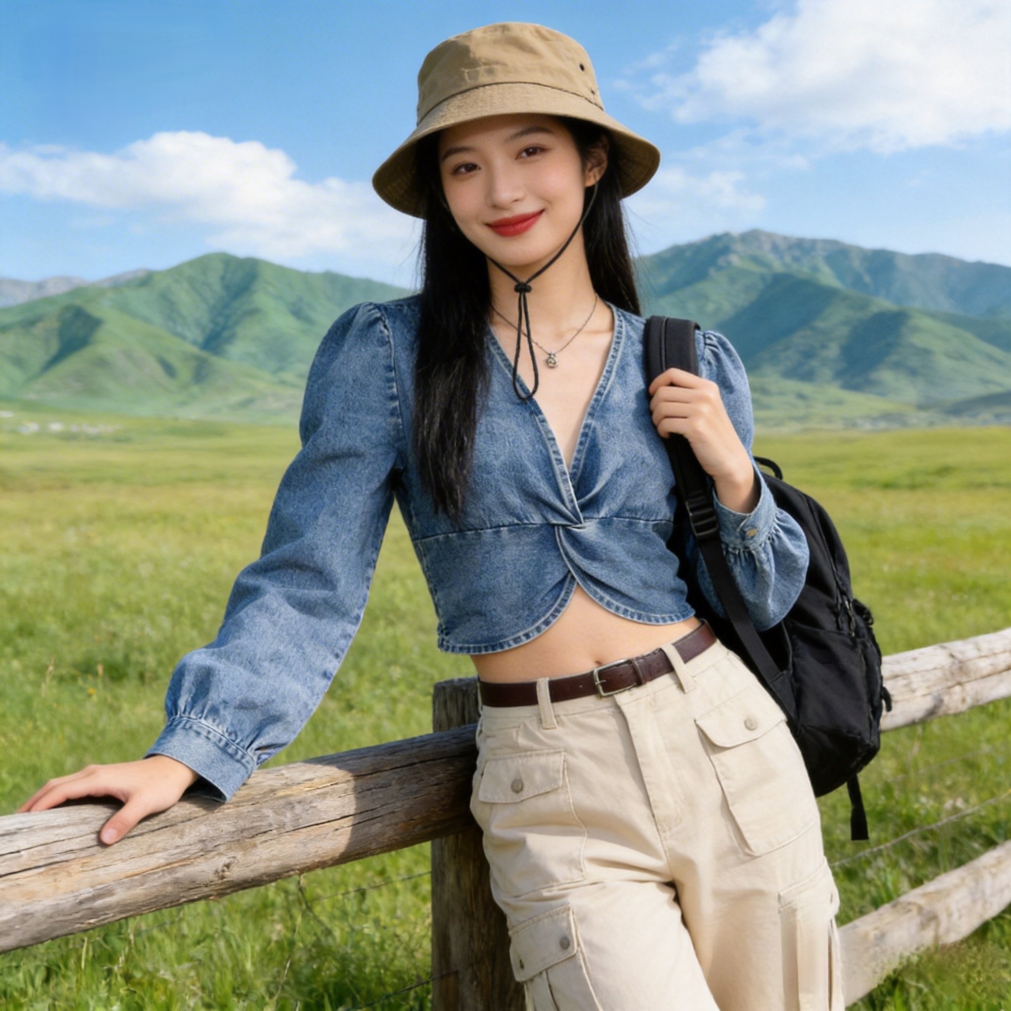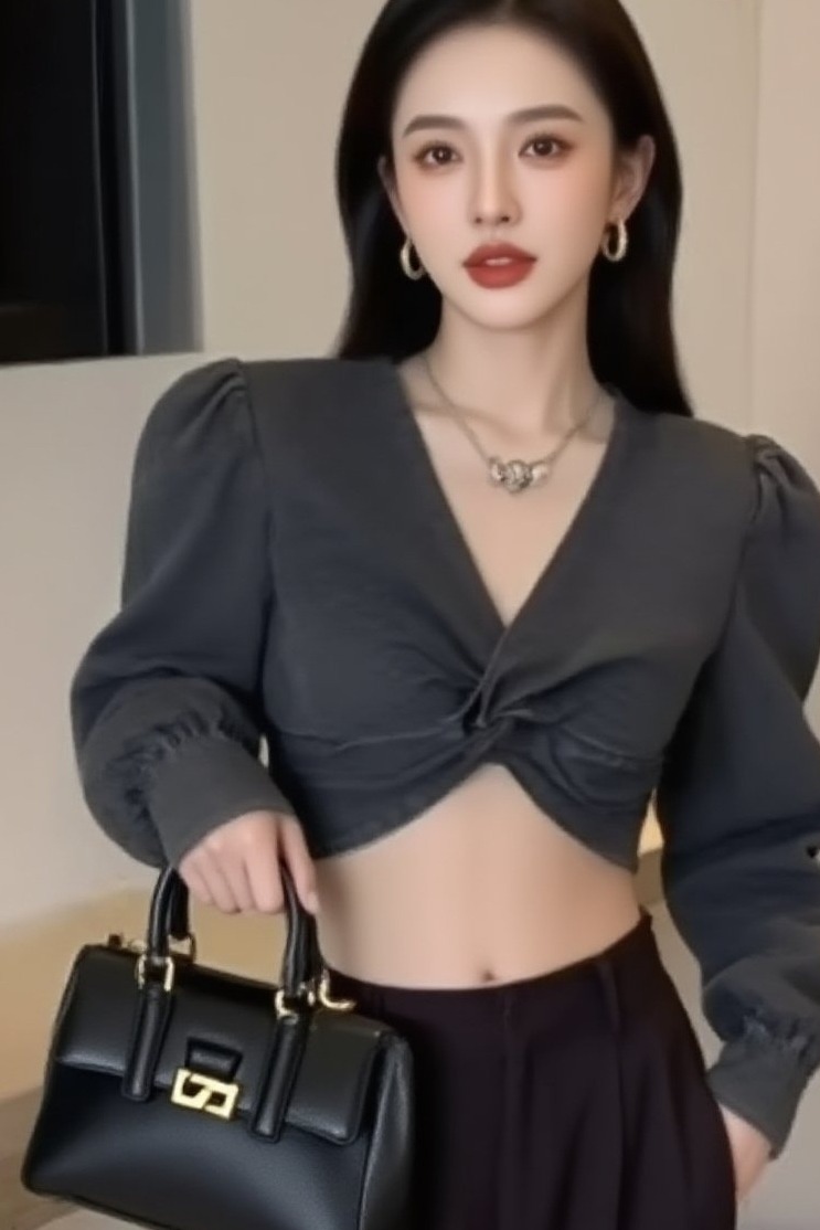 BY11784# 韩版新款殴美风性感时尚V领扭结侧边拉链泡泡袖薄款牛仔上衣 服裝批發女裝批發服飾貨源