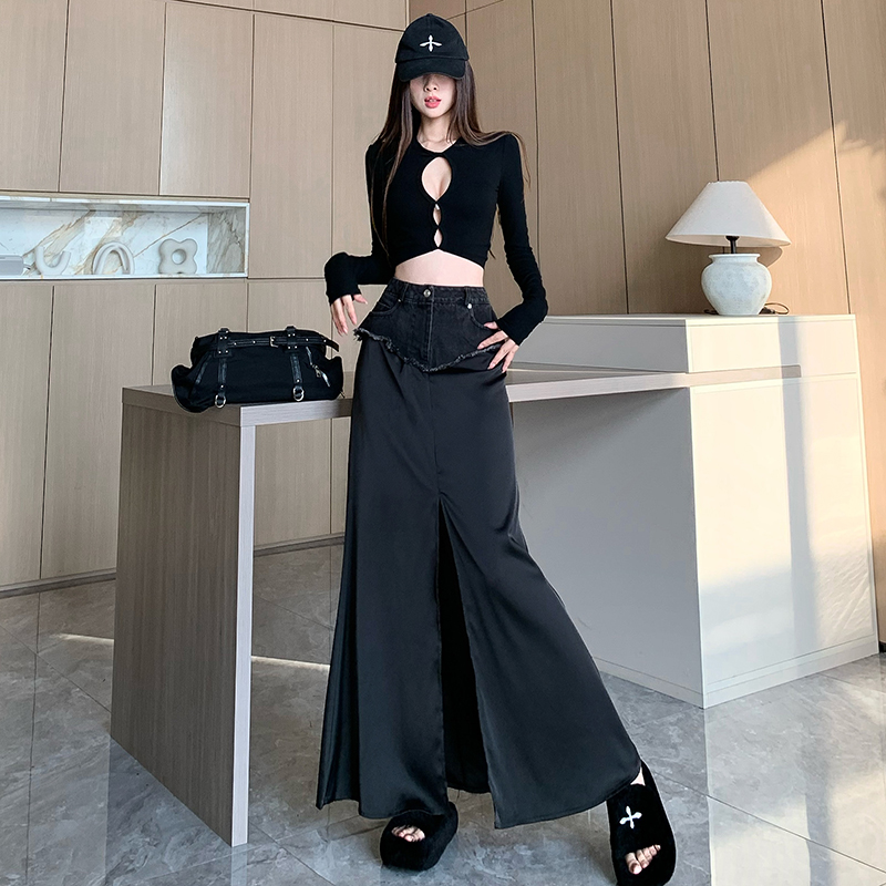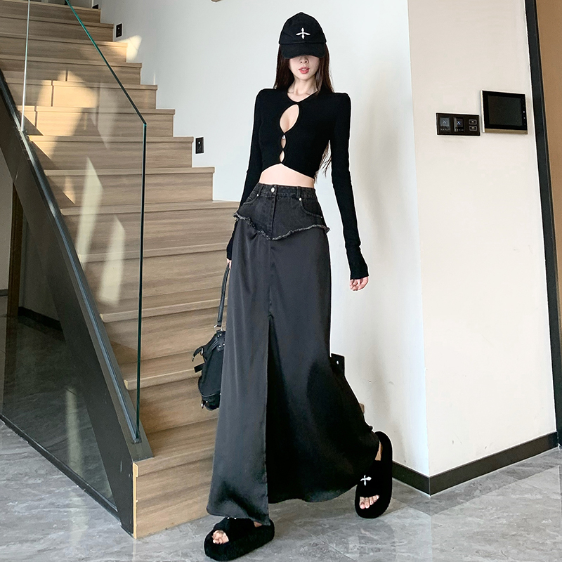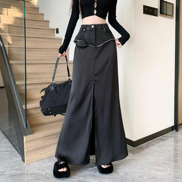 BY11823# 设计感高腰牛仔拼接黑色包臀裙夏季新款纯欲气质开叉长裙女 服裝批發女裝批發服飾貨源