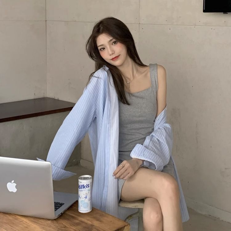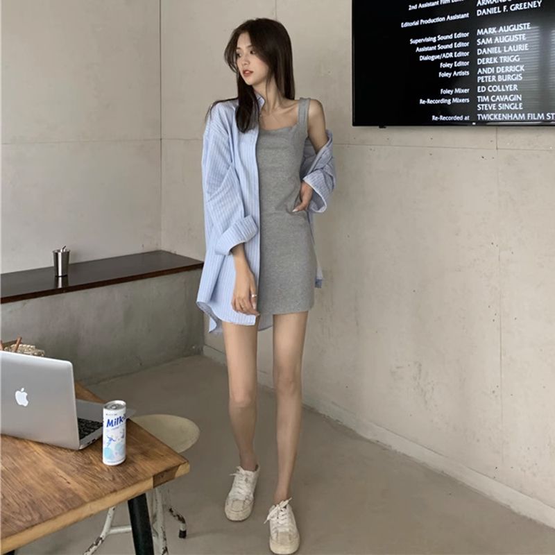 Home > 夜店裙、长袖连衣裙 > BY11870# 两件套装韩风女春夏季学生宽松POLO条纹衬衫+灰色吊带连衣裙潮流 服裝批發女裝批發服飾貨源