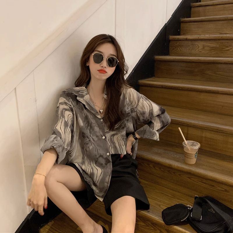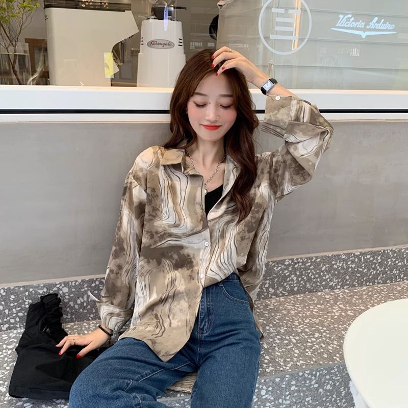 BY11871# 春季女网红复古水墨印花衬衫女学生港风设计感小众长袖T恤衬衣潮 服裝批發女裝批發服飾貨源