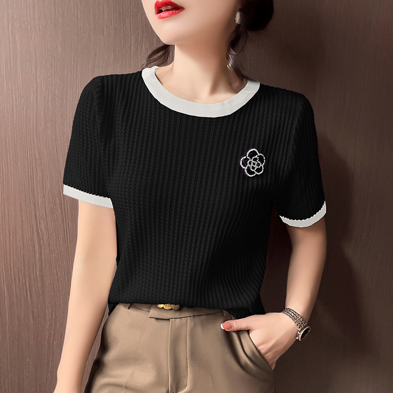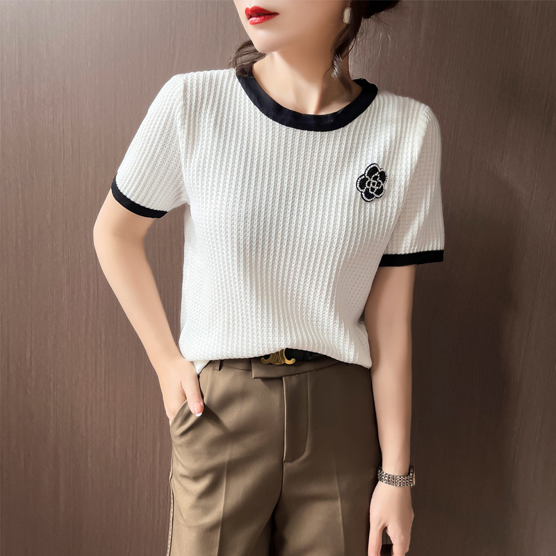 BY11881# 轻奢小香风夏新款山茶花钉珠装饰薄款冰丝针织上衣短袖T恤女 服裝批發女裝批發服飾貨源