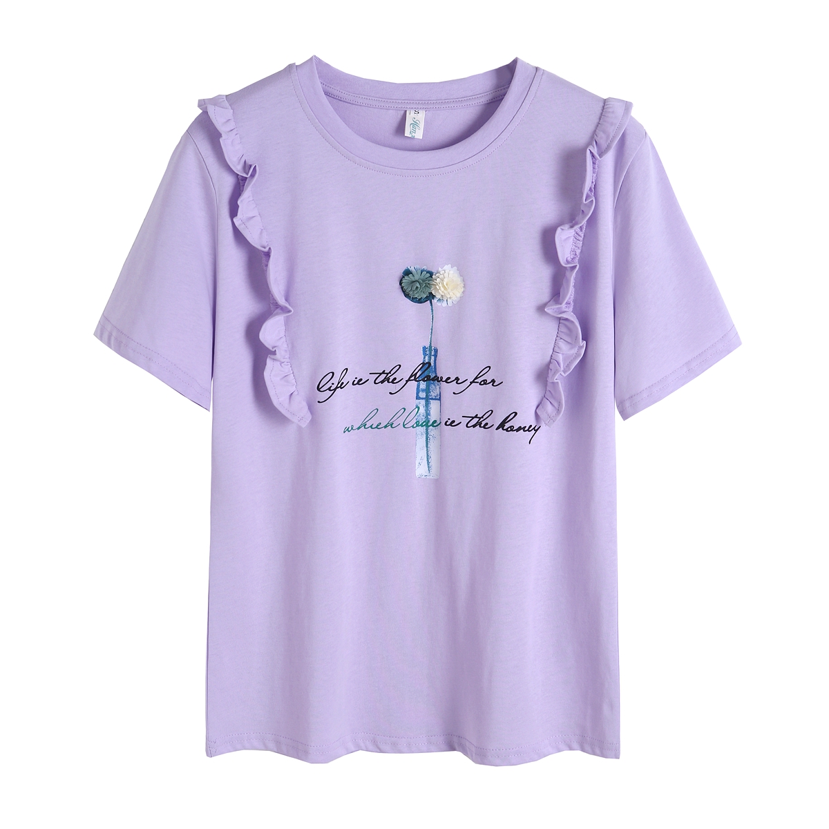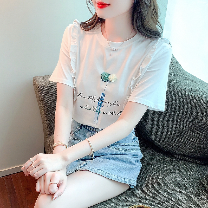 夏装新款韩版cec宽松圆领木耳边上衣设计感短袖印花T恤女潮 服裝批發女裝批發服飾貨源