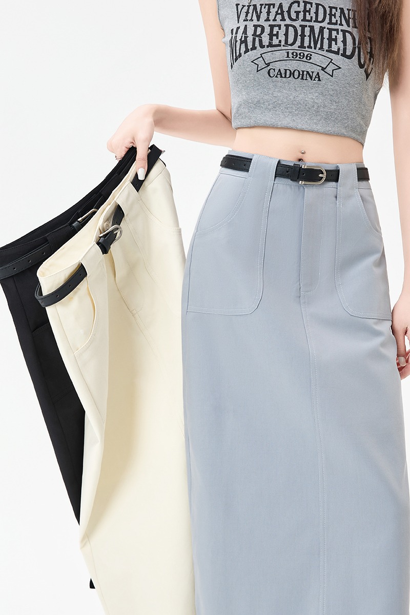 BY13860# 杏色天丝棉后开叉半身裙女中长款高腰显瘦春夏薄款a字包臀裙 服裝批發女裝批發服飾貨源