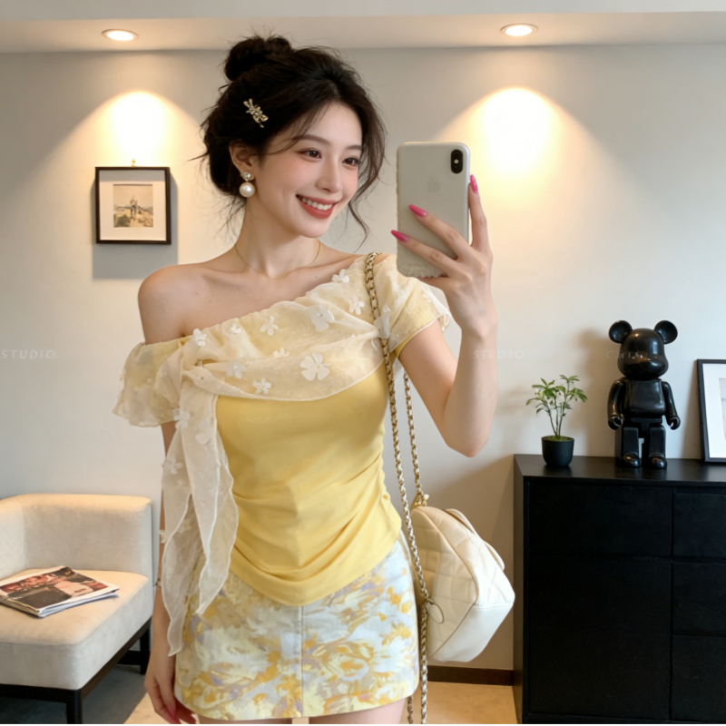 BY13898# 蕾丝立体花朵网纱拼接黄色短袖t恤女修身一字肩上衣 服裝批發女裝批發服飾貨源