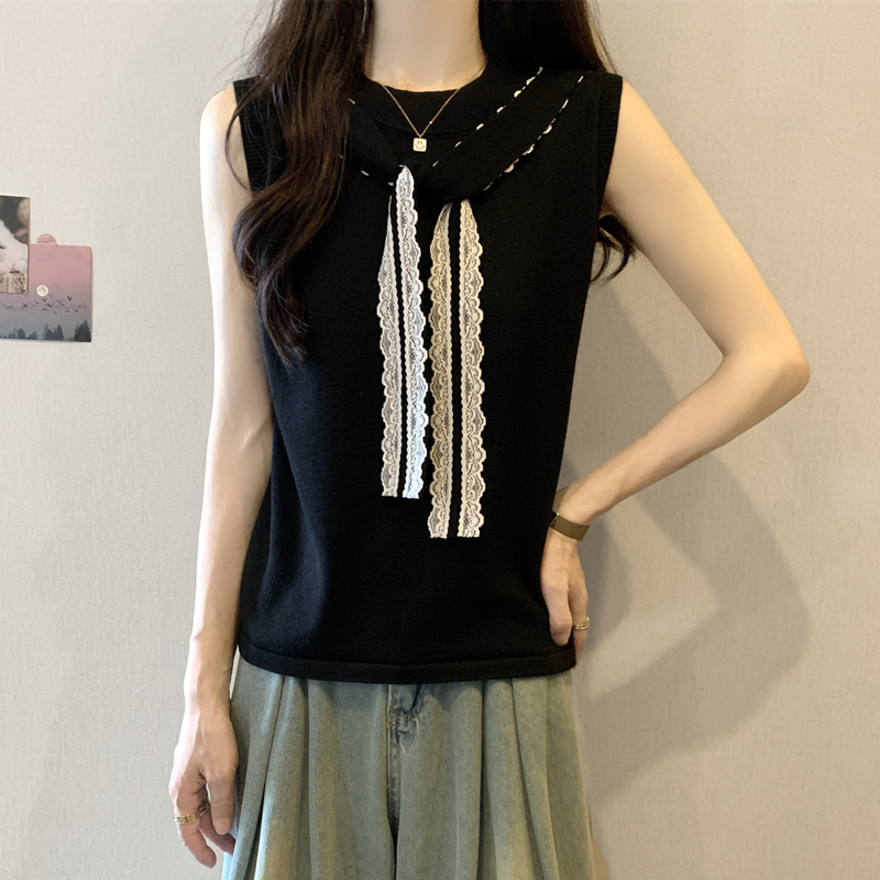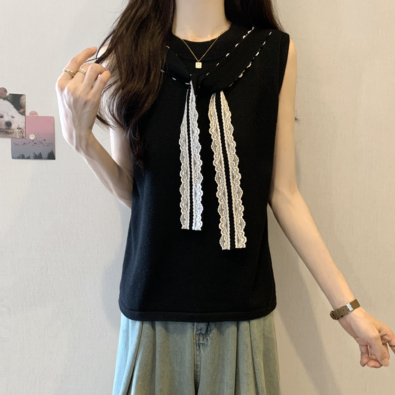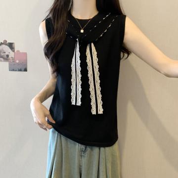 BY13905# 胖mm大码女装夏装设计感蕾丝飘带无袖T恤显瘦背心冰丝上衣 服裝批發女裝批發服飾貨源