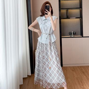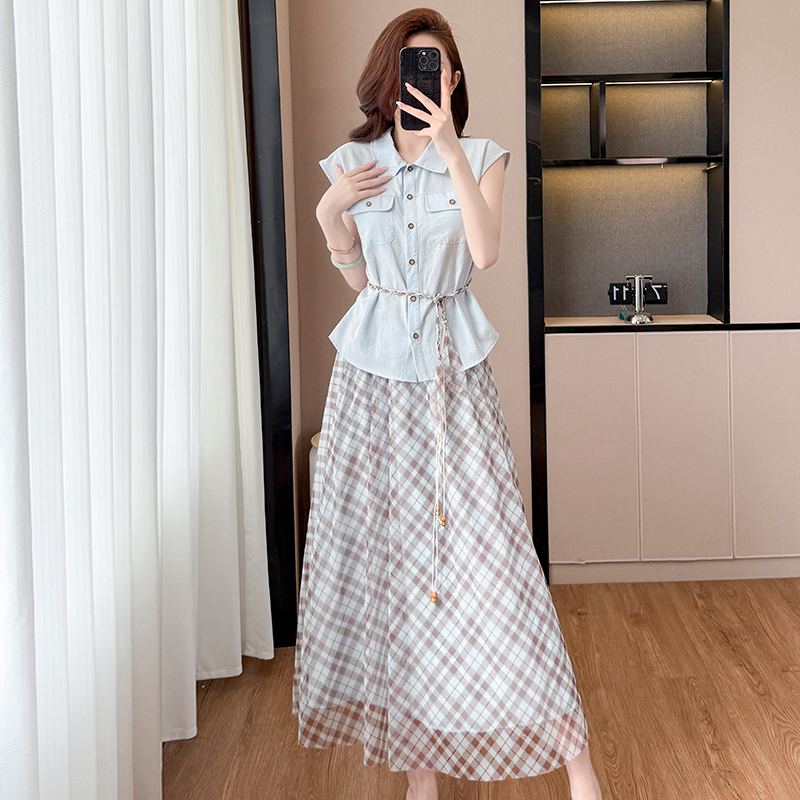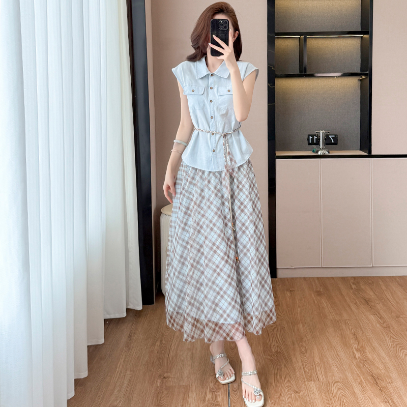 BY13917# 时尚休闲气质通勤套装夏季新款收腰显瘦无袖衬衫格纹半身裙两件套 服裝批發女裝批發服飾貨源