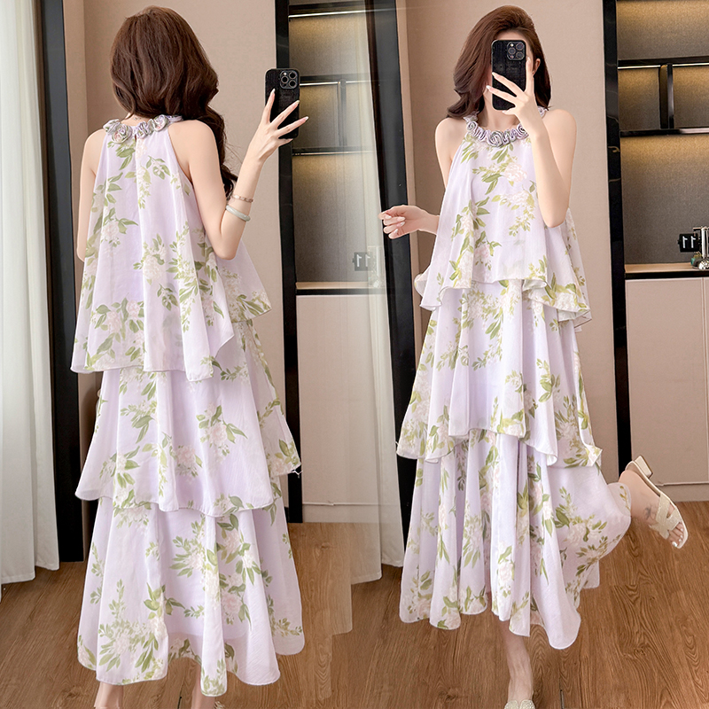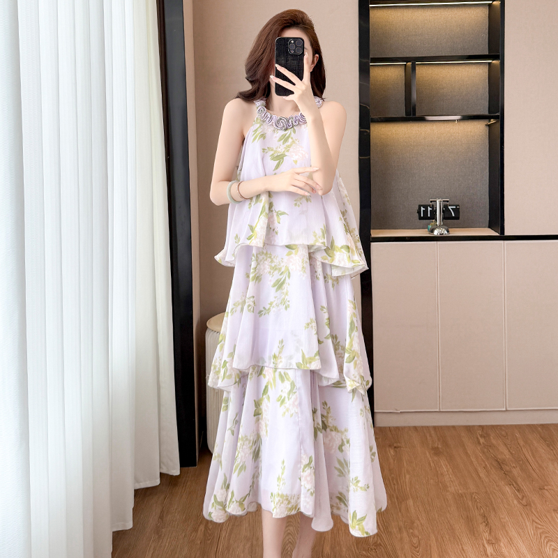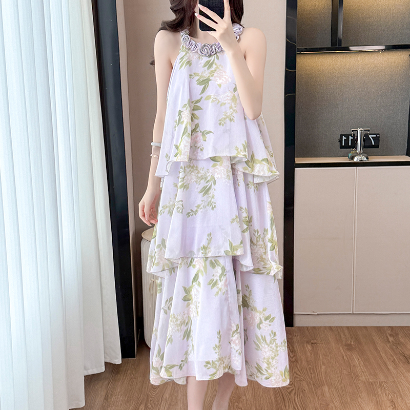 BY13919# 法式紫色碎花挂脖蛋糕裙女夏季度假风设计感小众中长款无袖连衣裙 服裝批發女裝批發服飾貨源