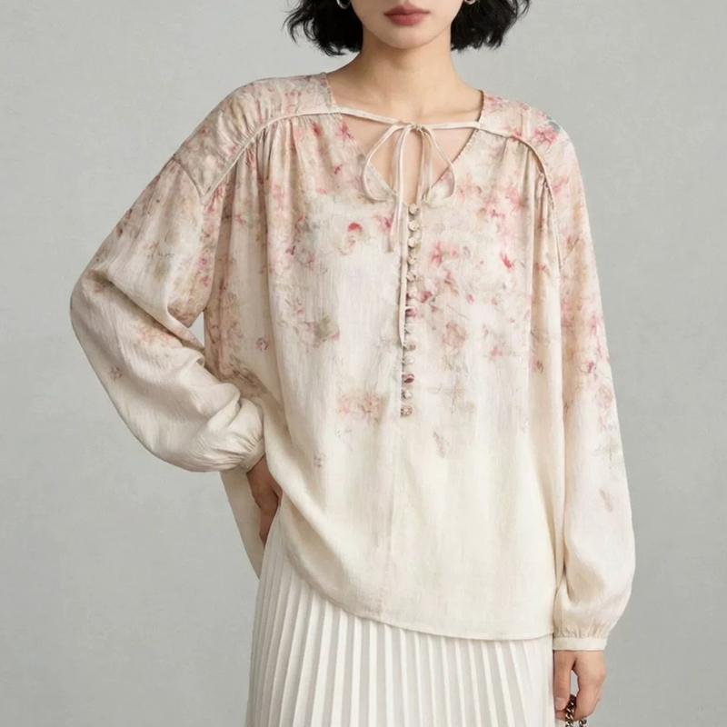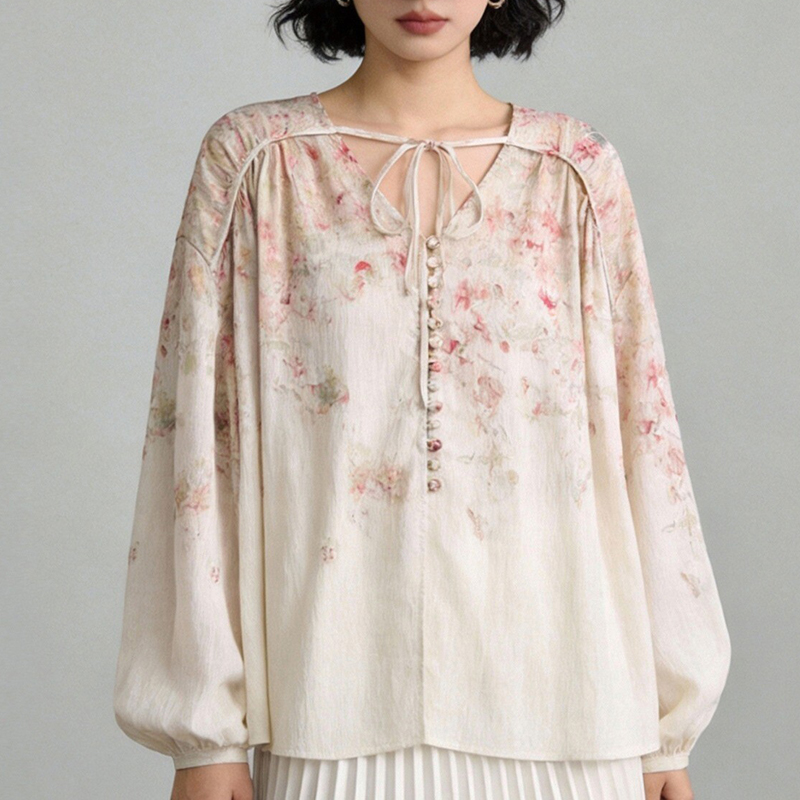 BY13926# 法式浪漫玫瑰印花灯笼袖宽松衬衫上衣女装早春新款衬衣 服裝批發女裝批發服飾貨源