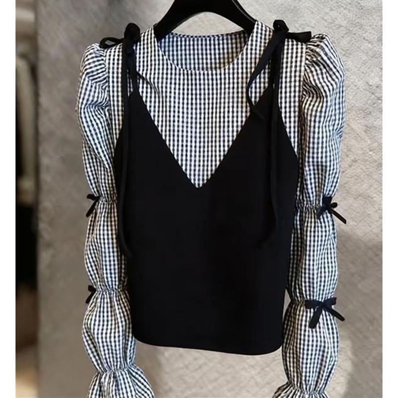 BY13932# 超火穿搭一整套小众设计感黑色吊带叠穿格纹衬衫两件套女春季 服裝批發女裝批發服飾貨源