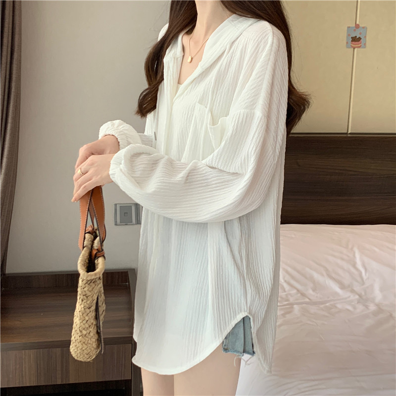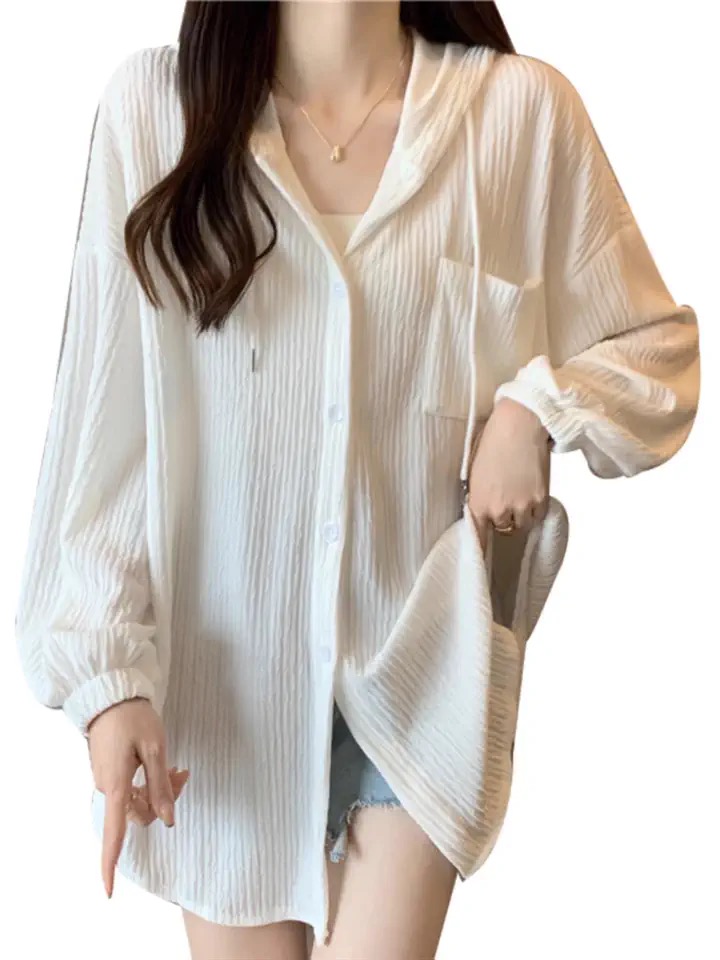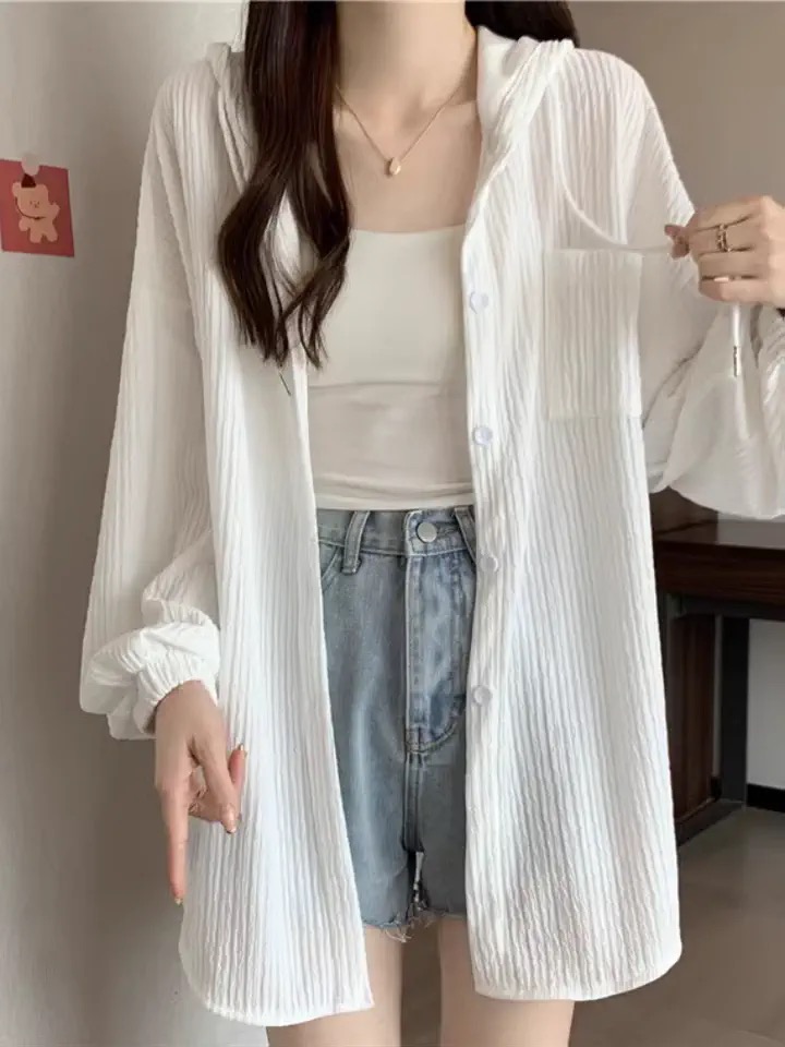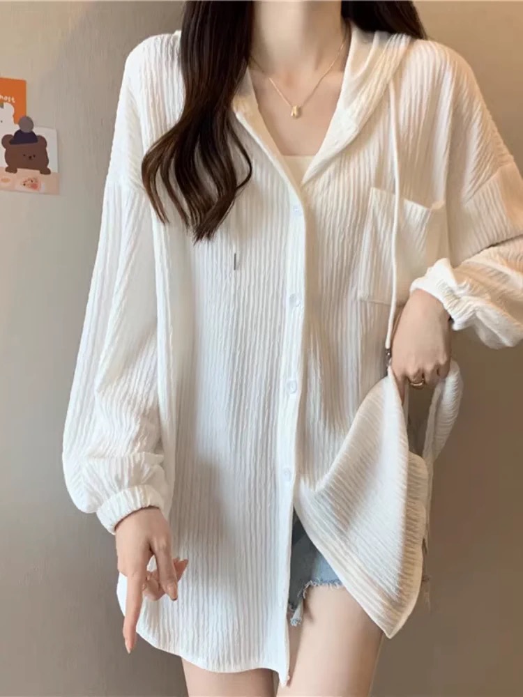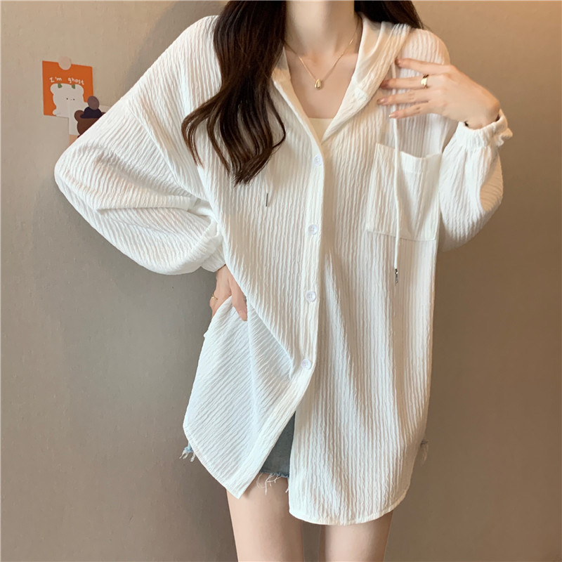 BY14032# 连帽薄款衬衫外套女夏季百搭宽松显瘦中长款开衫长袖防晒上衣 服裝批發女裝批發服飾貨源