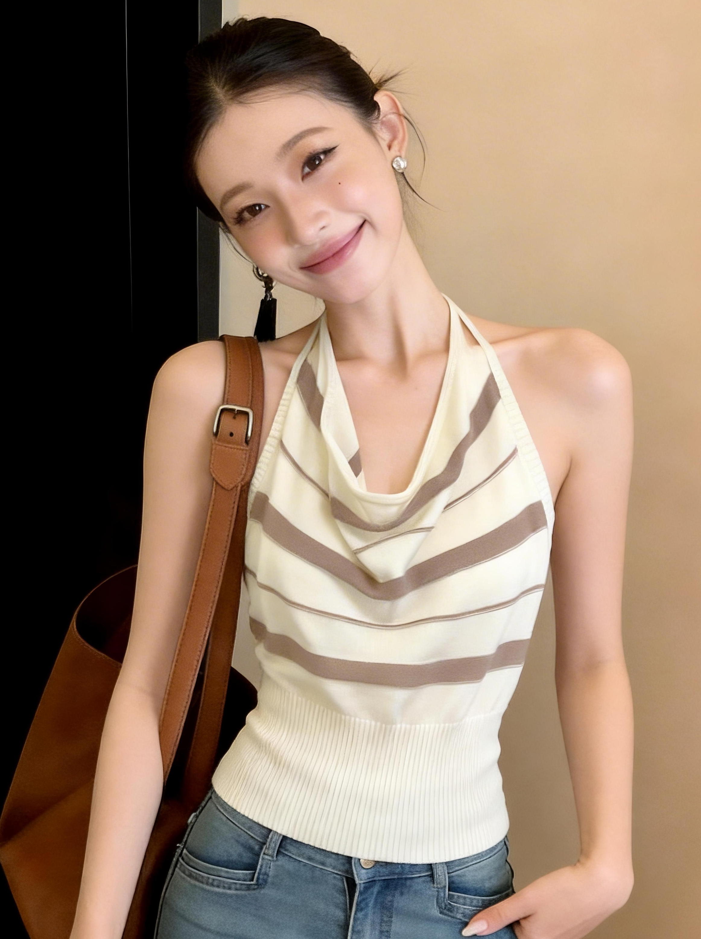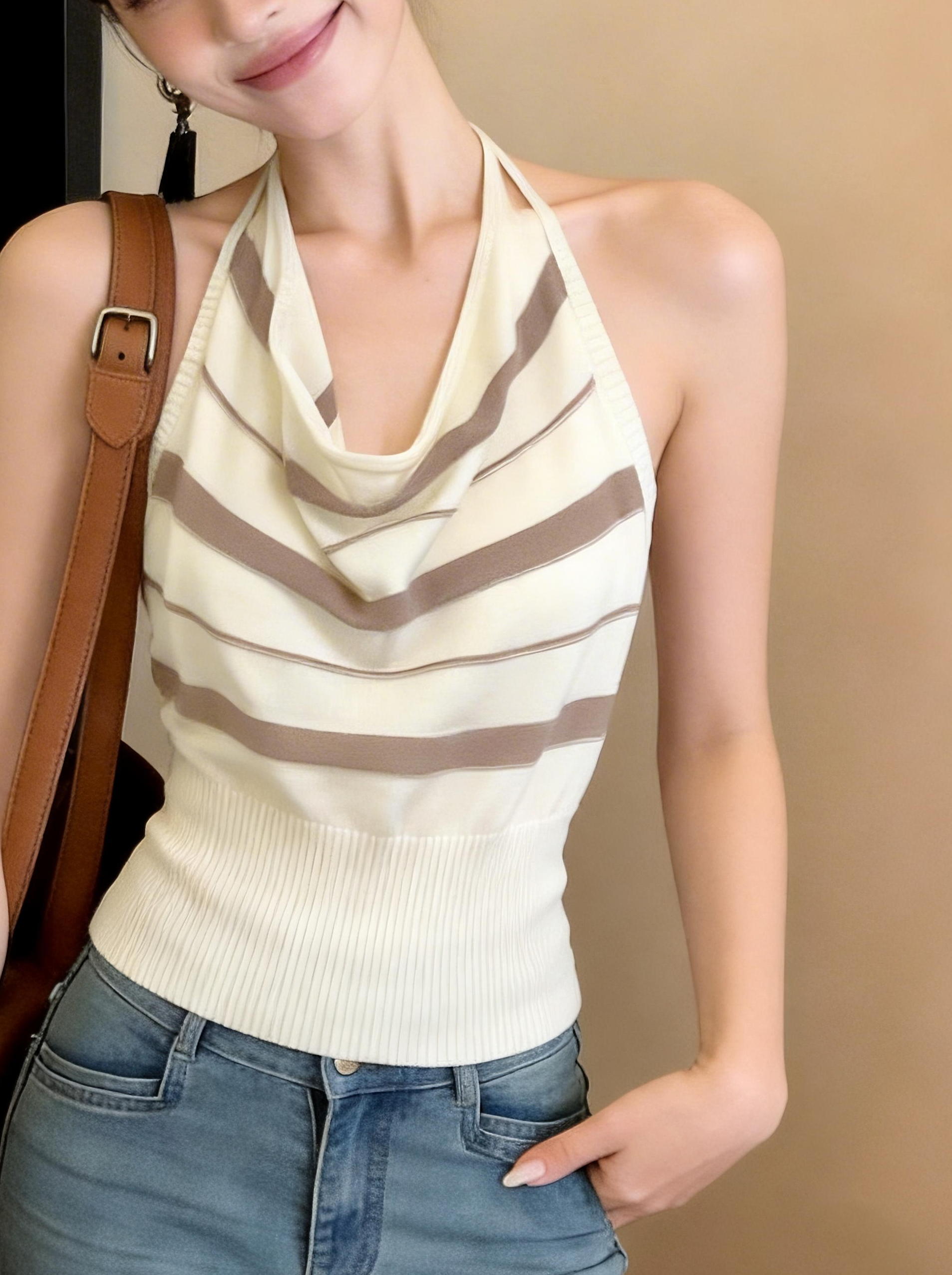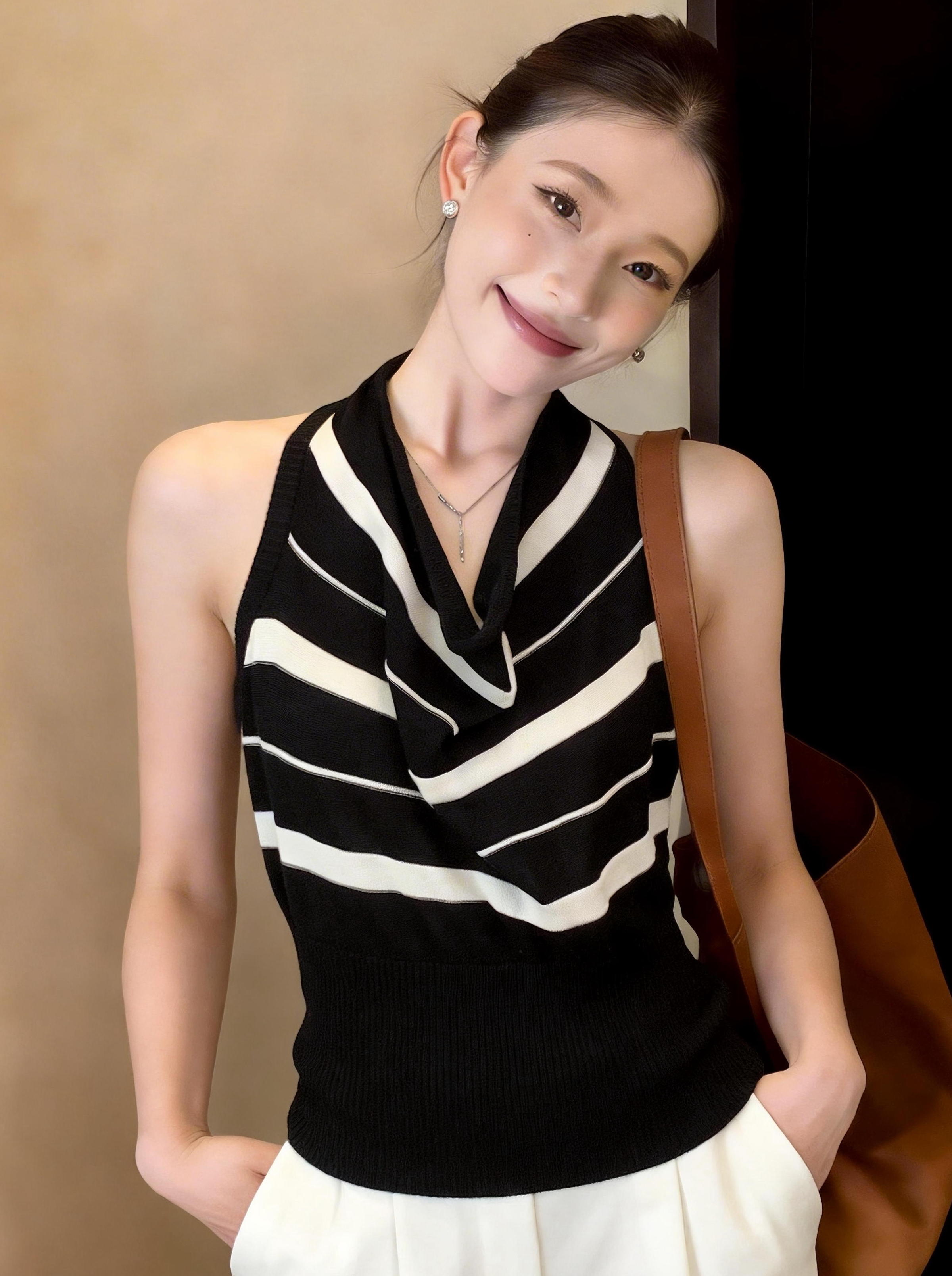 BY14072# 条纹荡领挂脖吊带背心女夏季新款法式纯欲风露背收腰显瘦上衣 服裝批發女裝批發服飾貨源