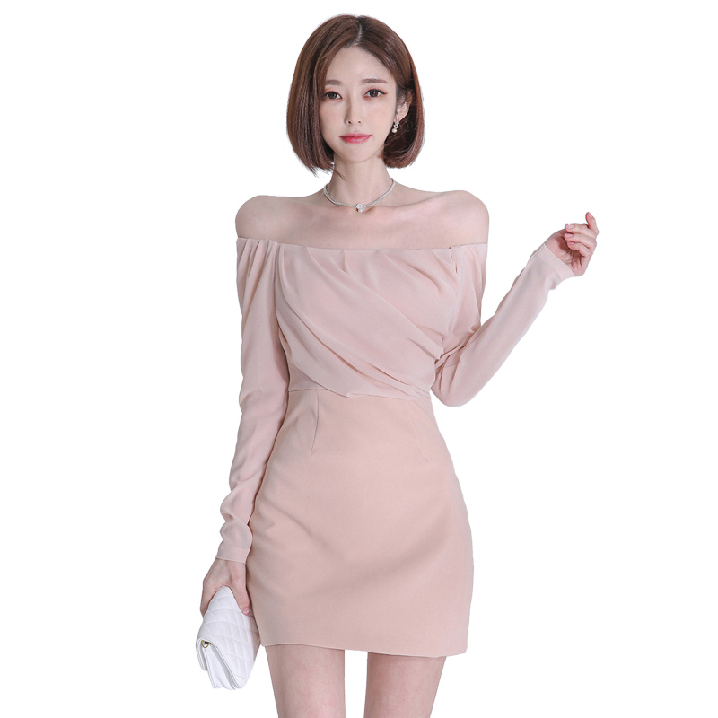 BY14217# 一字肩长袖连衣裙女温柔风褶皱收腰显瘦包臀短款约会小礼裙 服裝批發女裝批發服飾貨源
