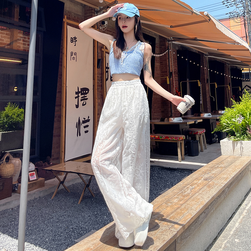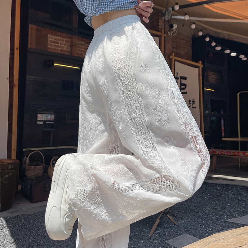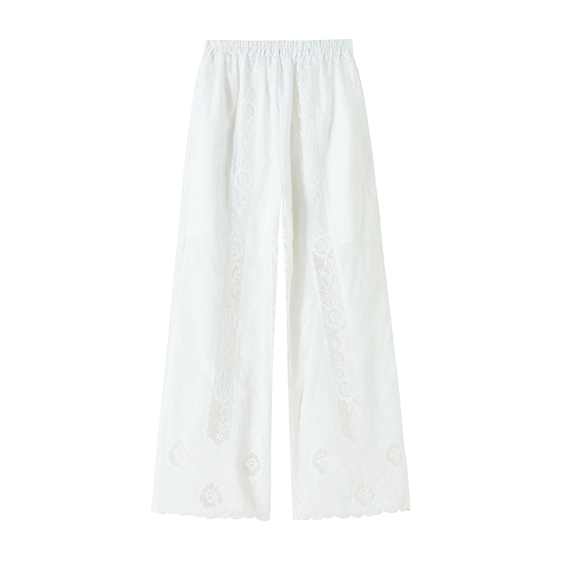 BY14227# 刺绣镂空阔腿裤设计感高腰显瘦松紧腰荷叶边裤脚垂感休闲裤 服裝批發女裝批發服飾貨源