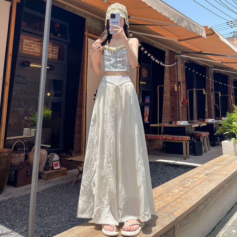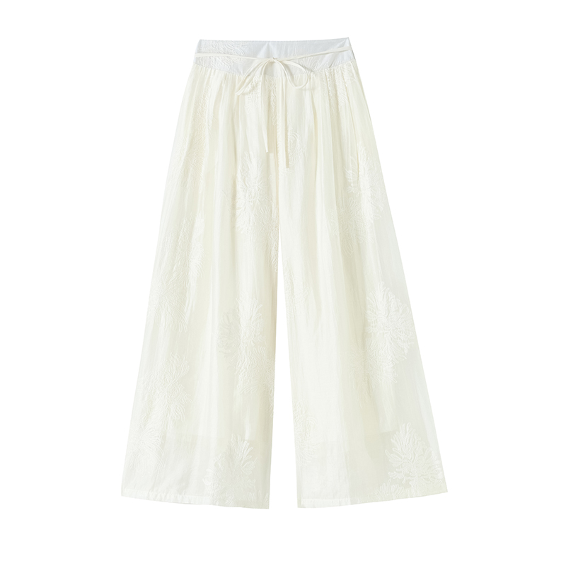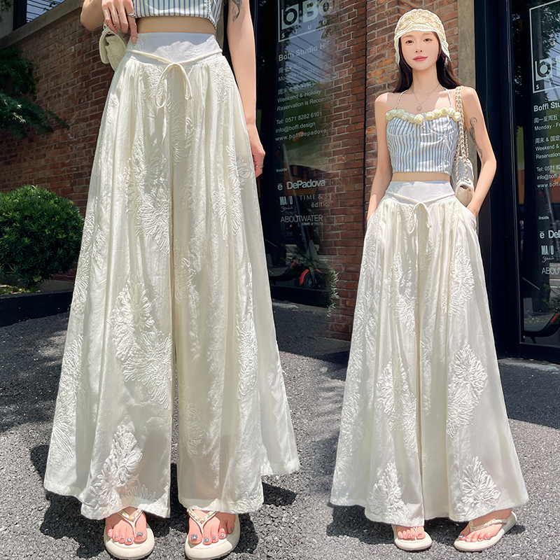 BY14229# 刺绣设计感阔腿裤高腰显瘦松紧腰绑带垂感国风休闲裤 服裝批發女裝批發服飾貨源