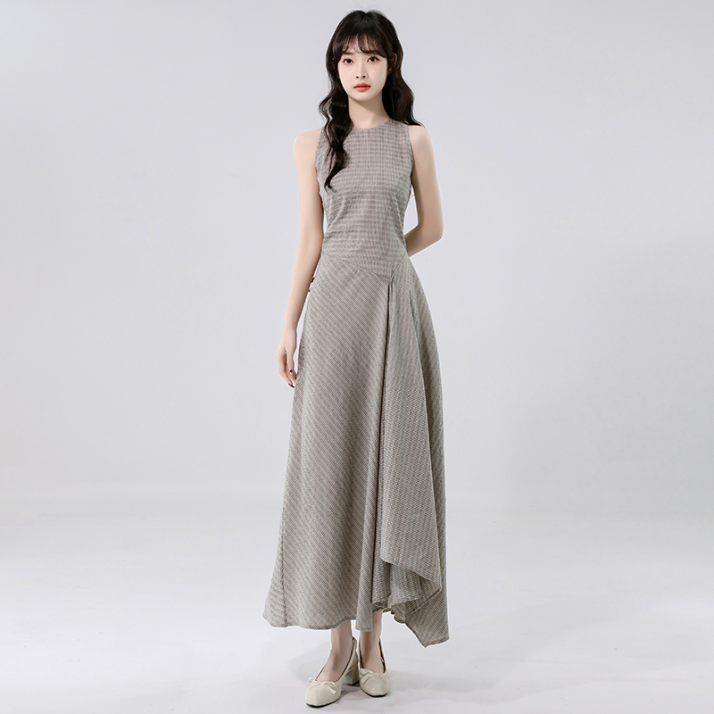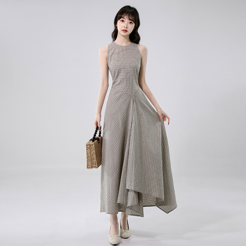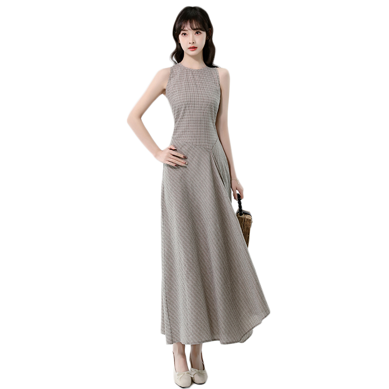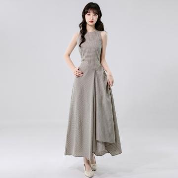 BY14241# 高知冷都女格纹掐腰连衣裙夏新修身显瘦气质圆领无袖长裙 服裝批發女裝批發服飾貨源