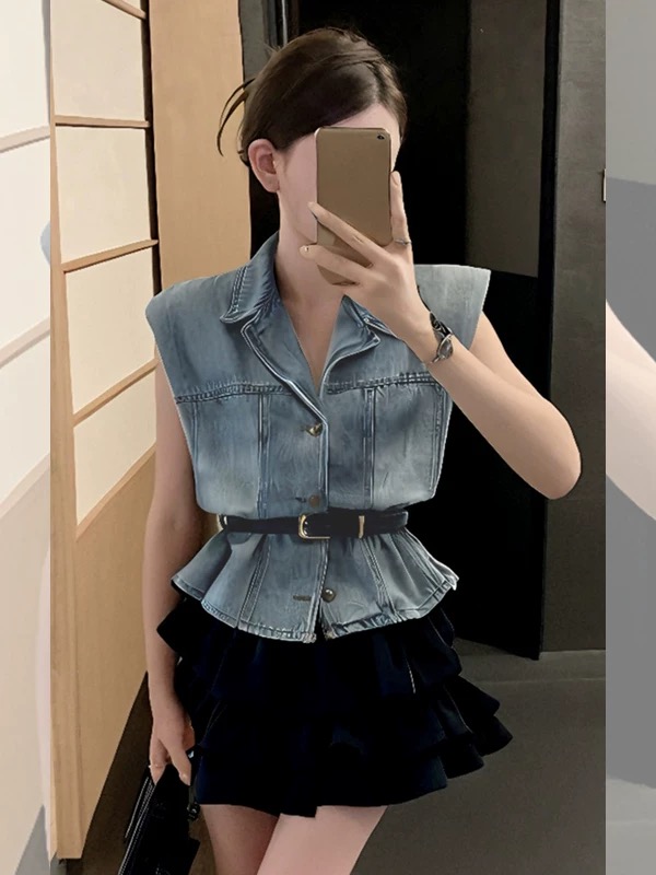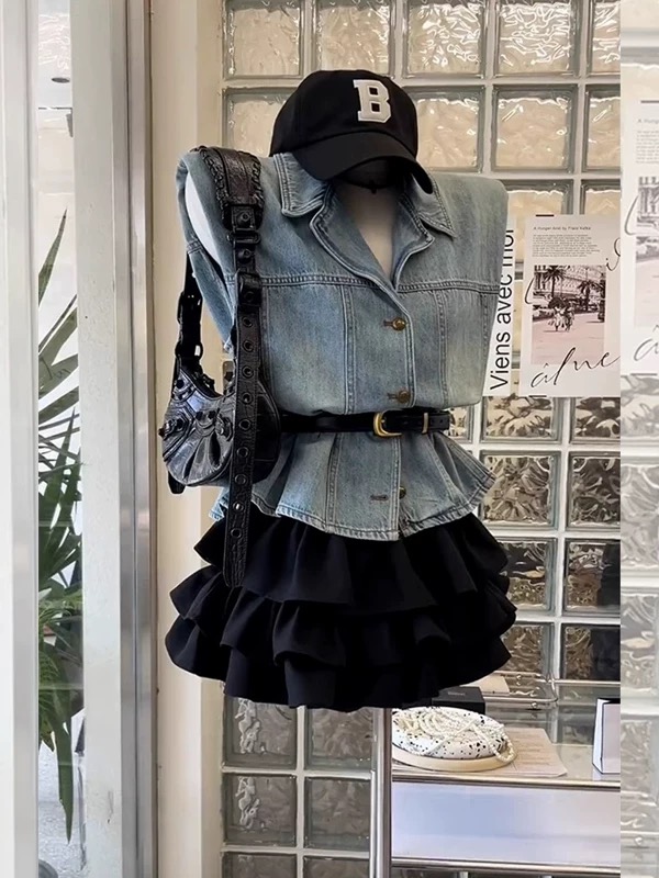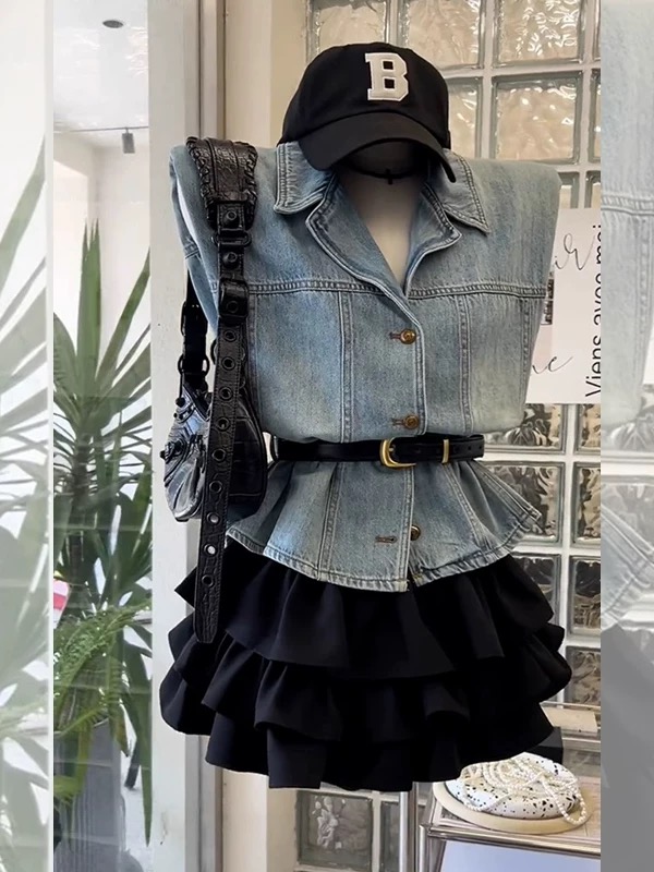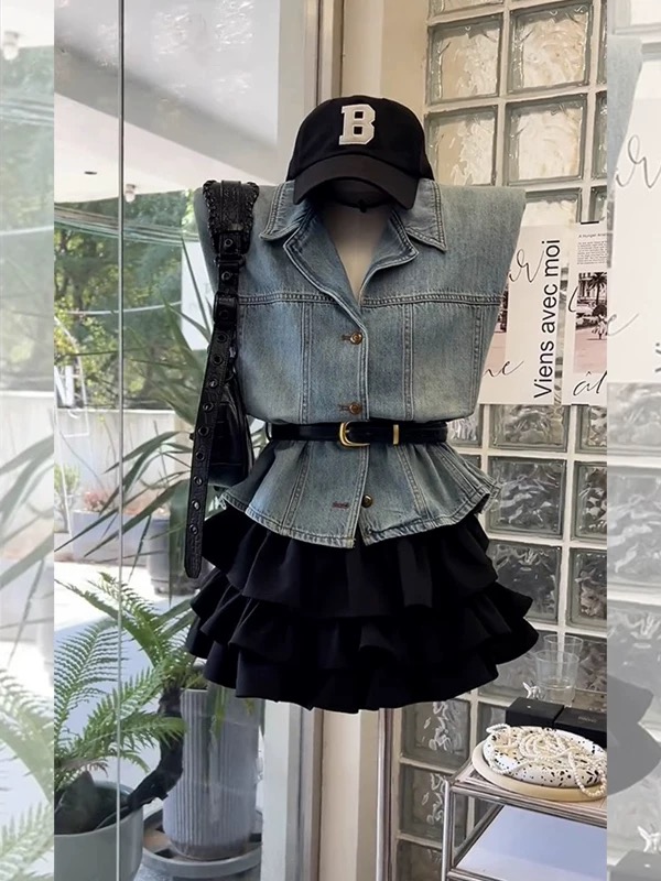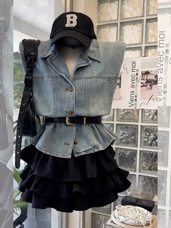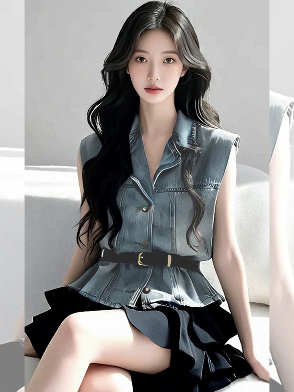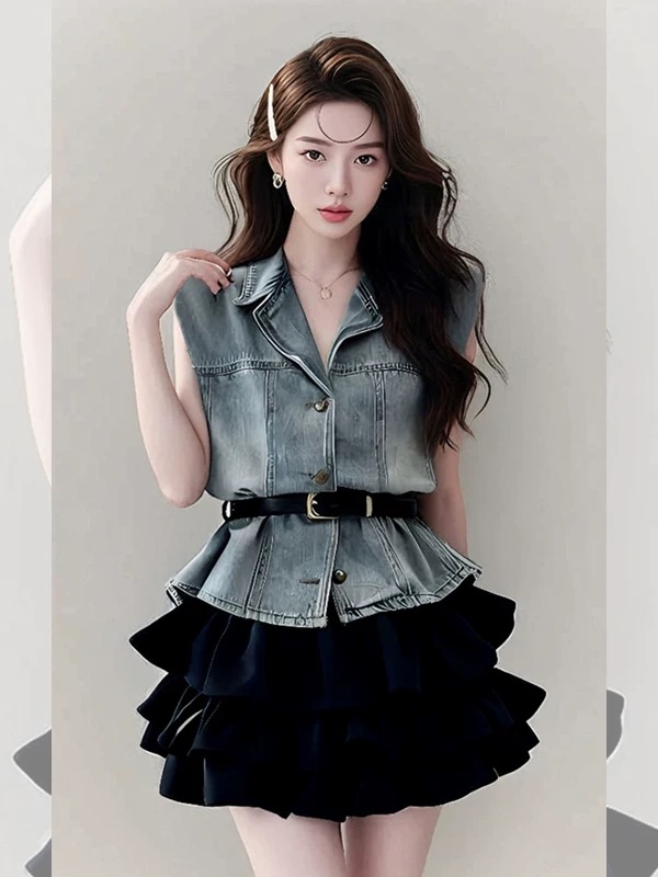 BY14251# 夏季穿搭一整套超火新款韩版气质蓝色无袖牛仔马甲短裙两件套 服裝批發女裝批發服飾貨源