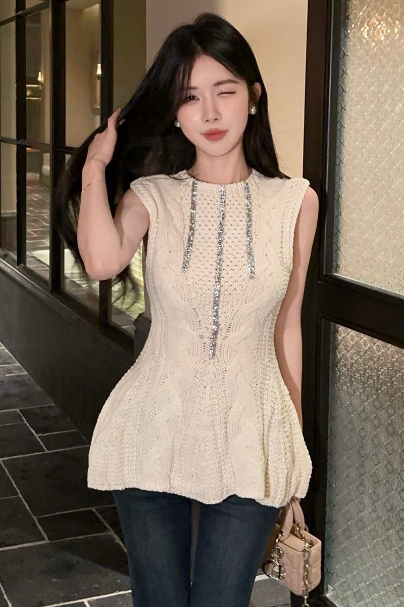 Home > 毛衣、针织衫 > BY15146# 钻条设计麻花无袖毛衣内搭小众针织收腰小摆裙上衣 服裝批發女裝批發服飾貨源