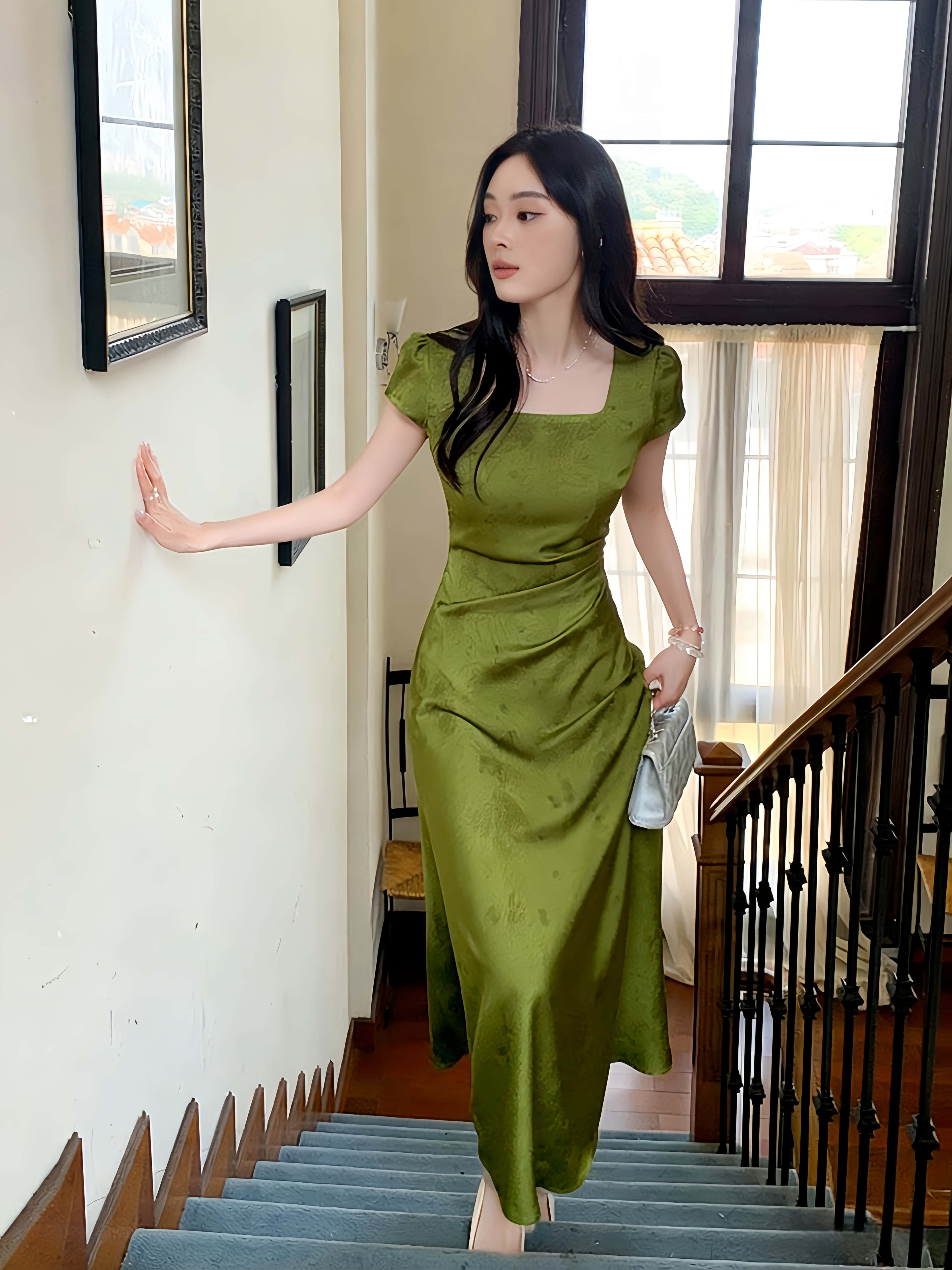 BY15172# 法式高级感夏季新原创斜裁优雅缎面提花方领短袖连衣裙 服裝批發女裝批發服飾貨源