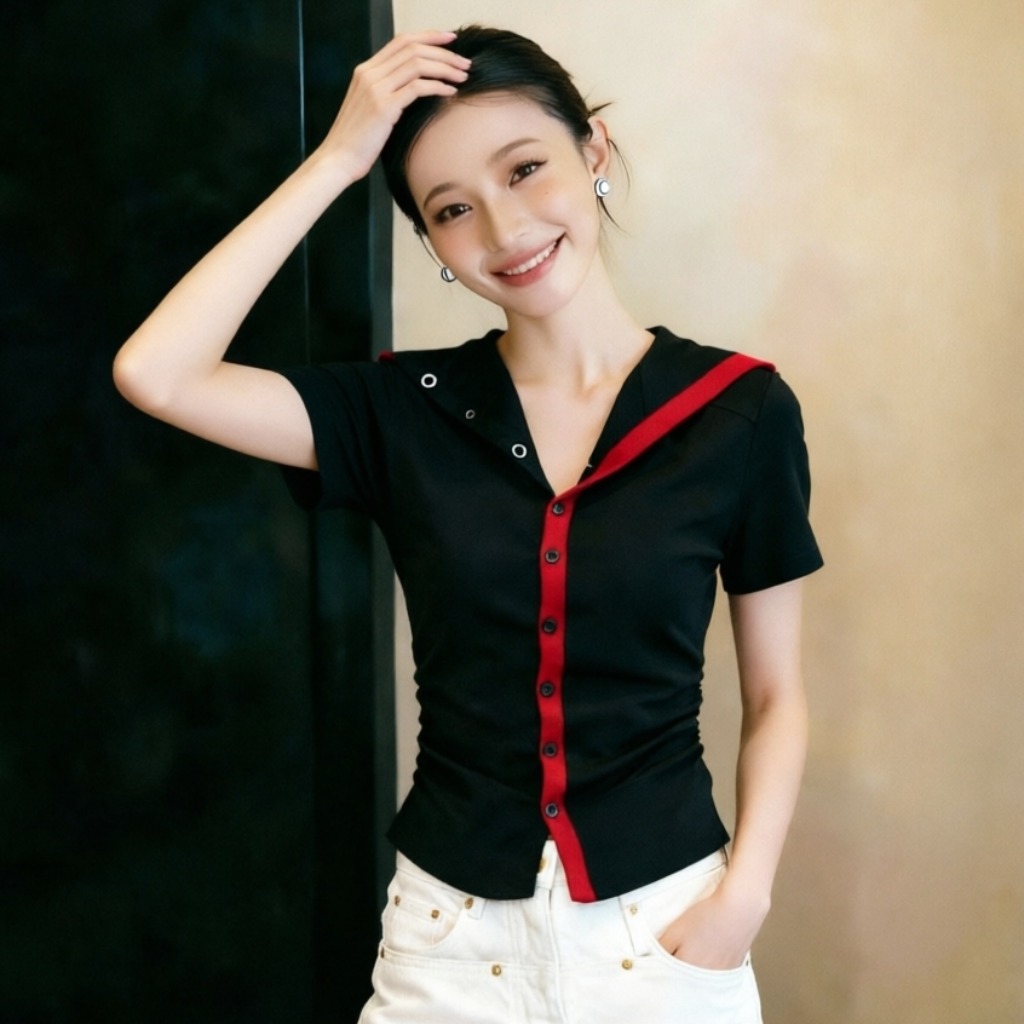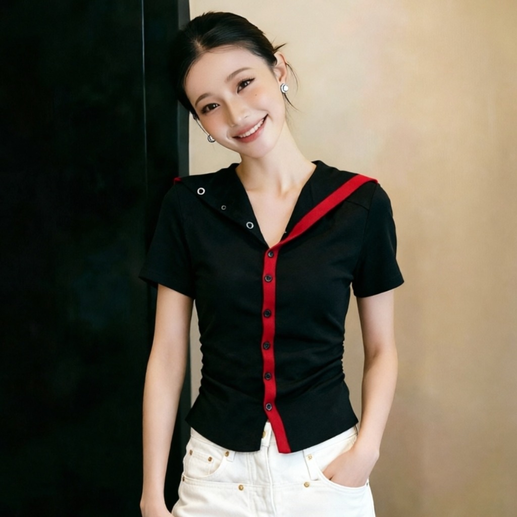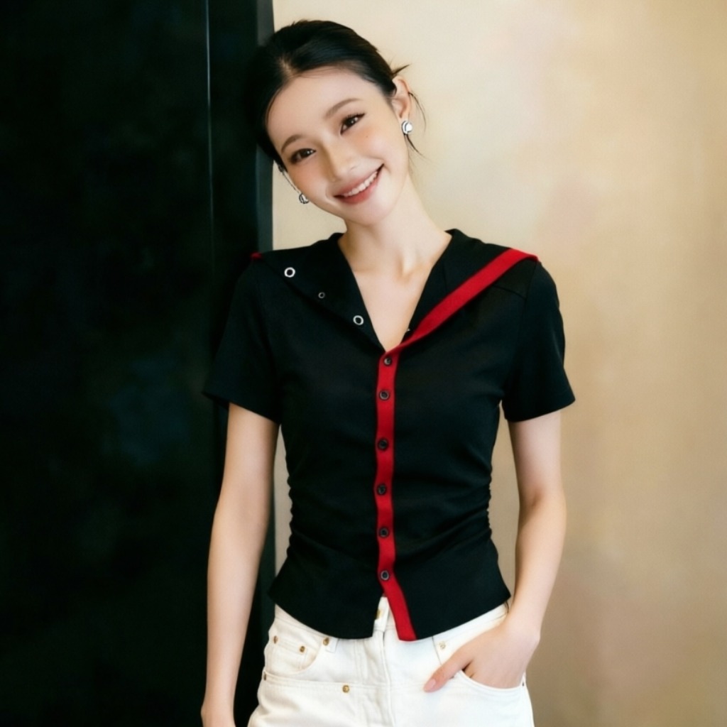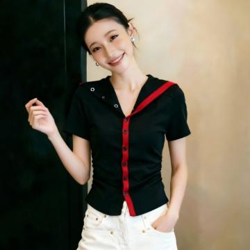 Home > 短袖T恤 > BY15643# 夏季新款排扣海军领撞色洋气褶皱收腰短袖T恤修身上衣 服裝批發女裝批發服飾貨源