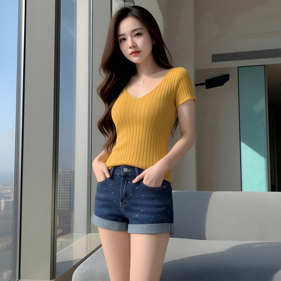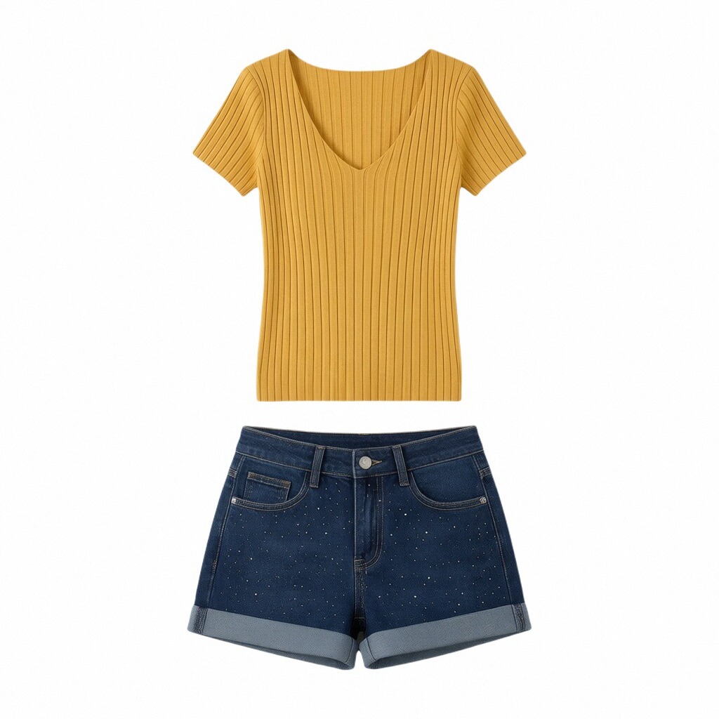 BY16650# 套装女夏季搭配一整套两件套黄色V领针织衫+镶钻牛仔短裤