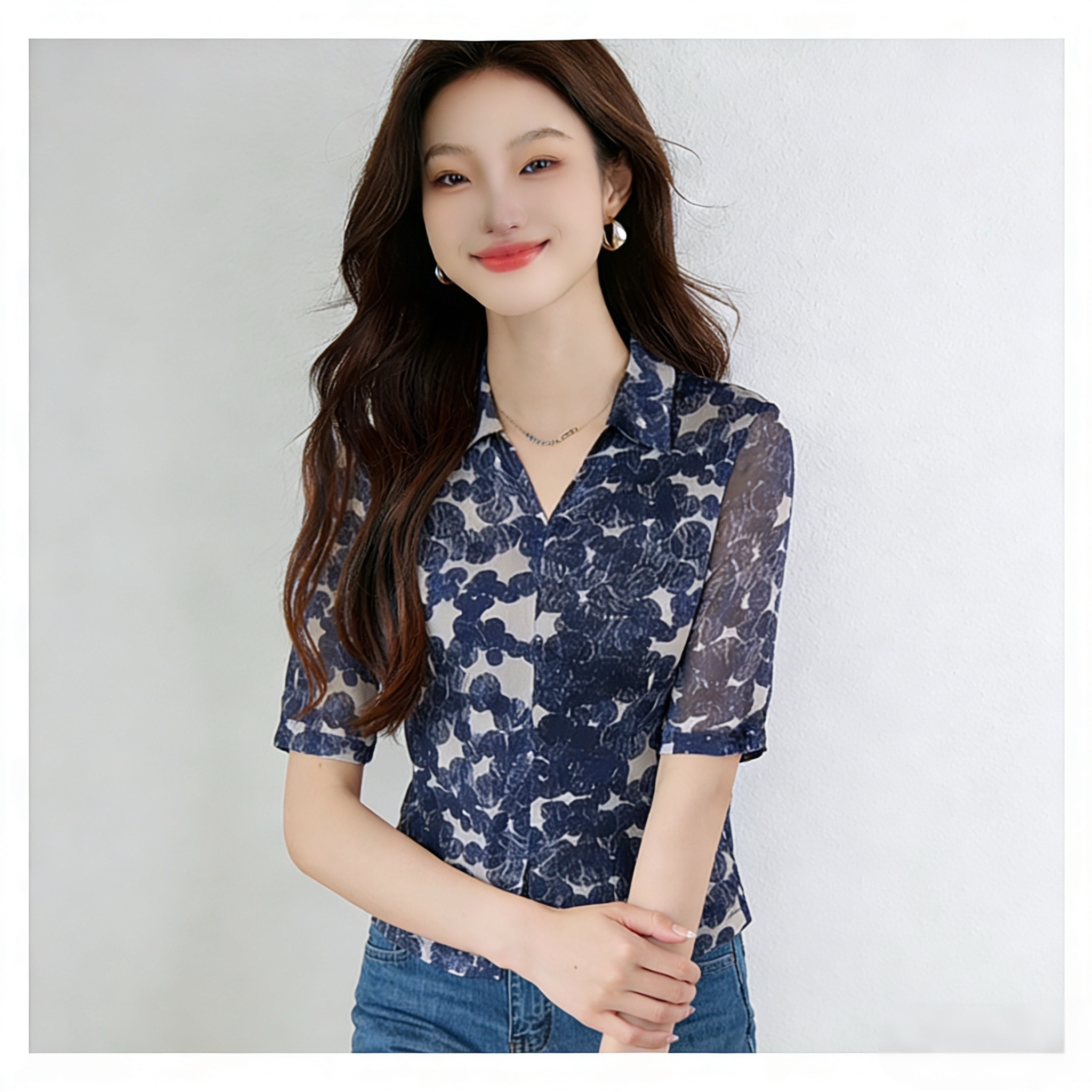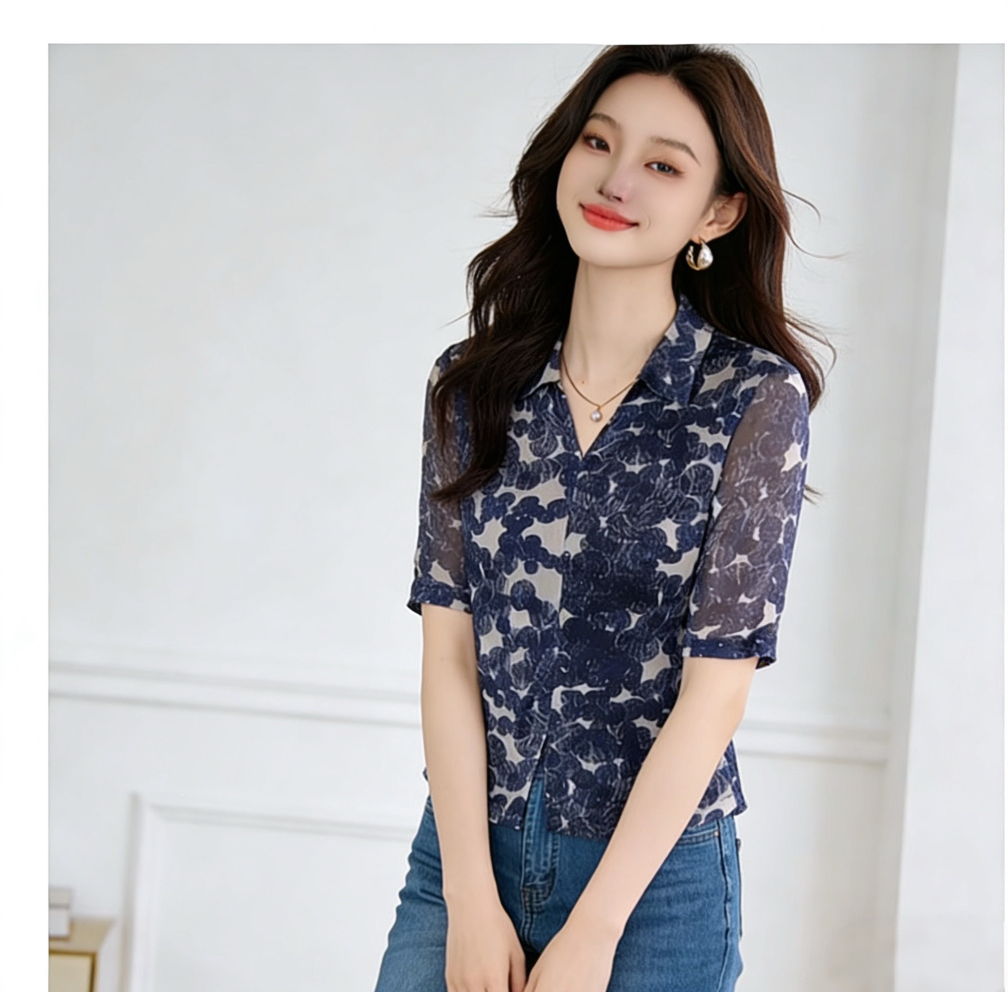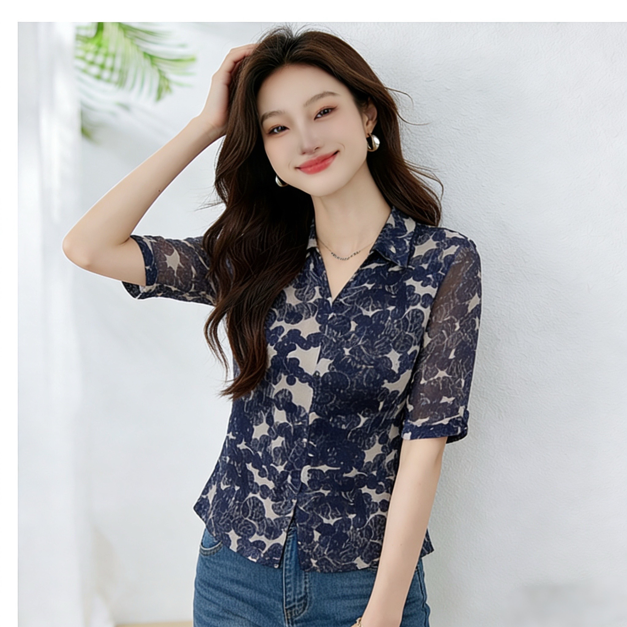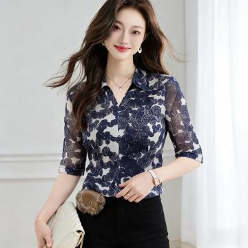 BY16778# 夏季新款V领印花雪纺衫女气质通勤中袖衬衫