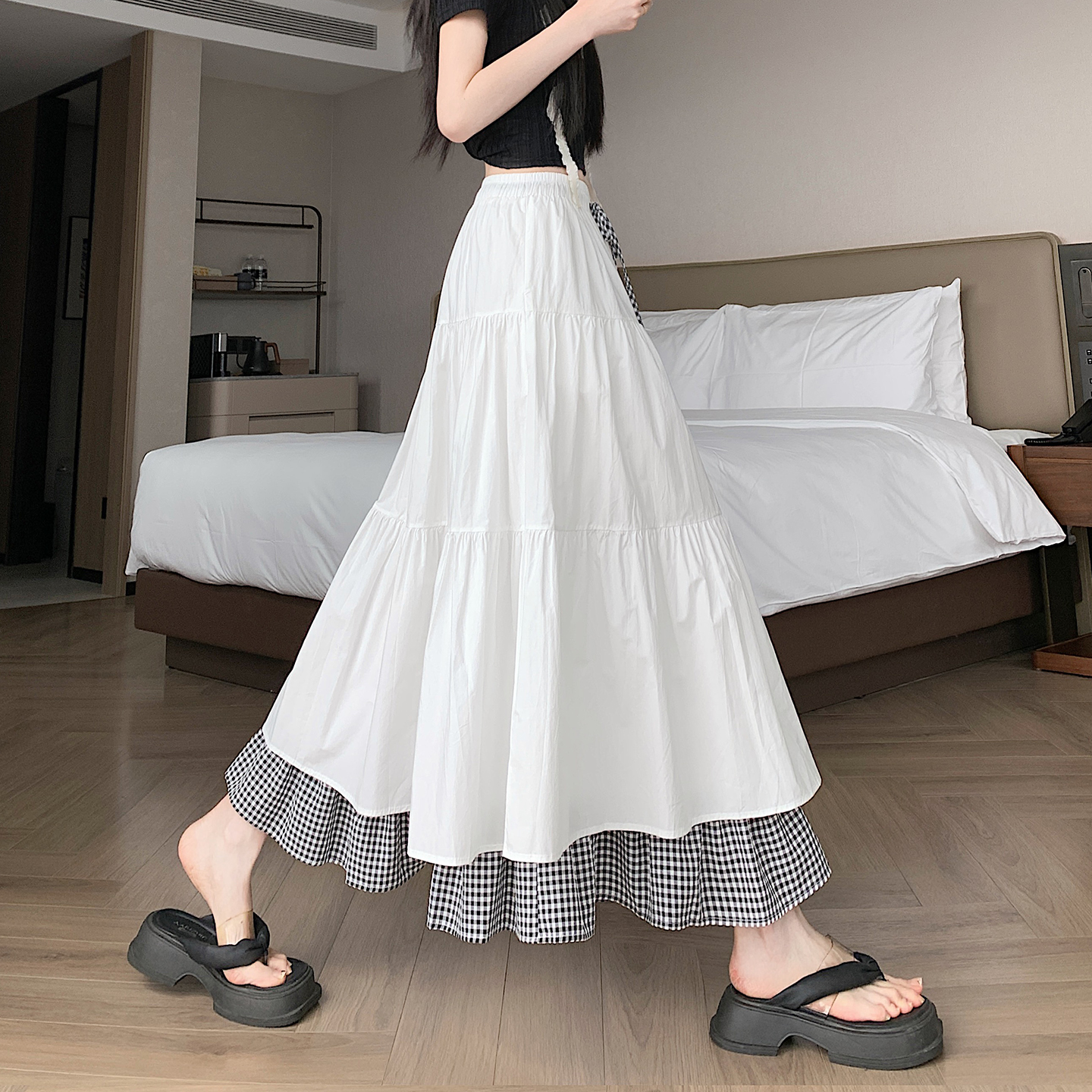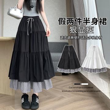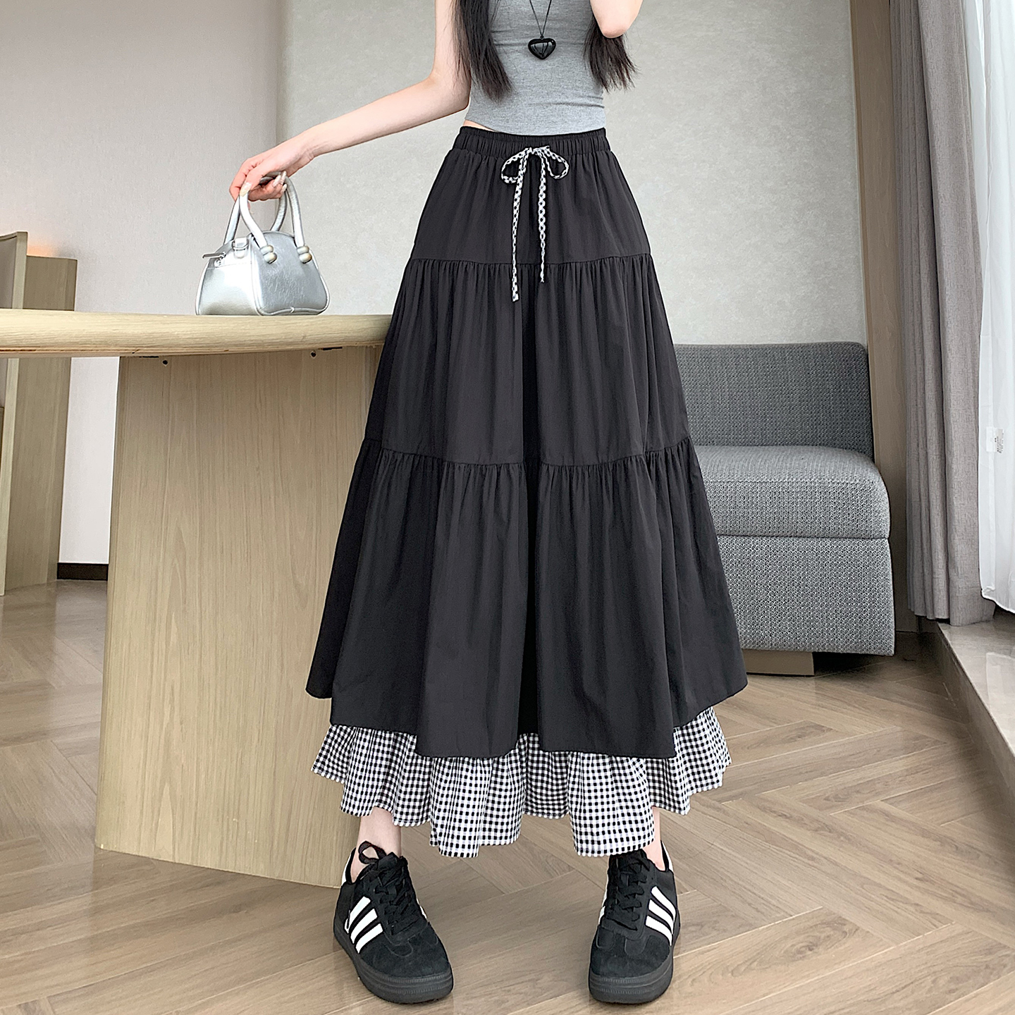 BY16788# 夏韩系松紧腰遮胯显瘦中长抽绳拼接格纹半身a字大摆伞裙