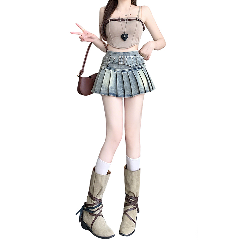 BY16805# 美式纯欲风辣妹设计感弹力牛仔百褶半身裙裤裙