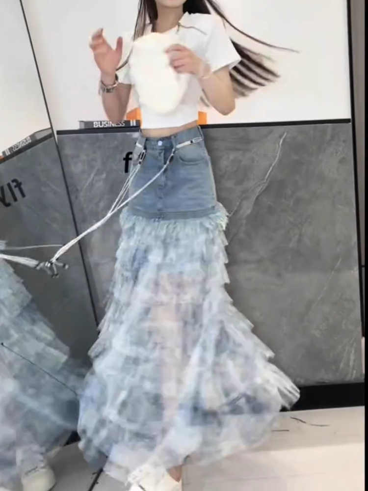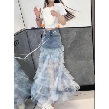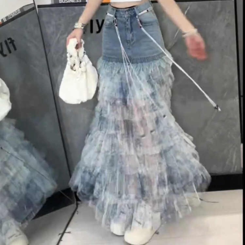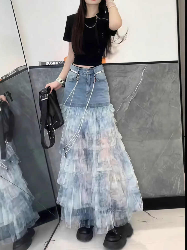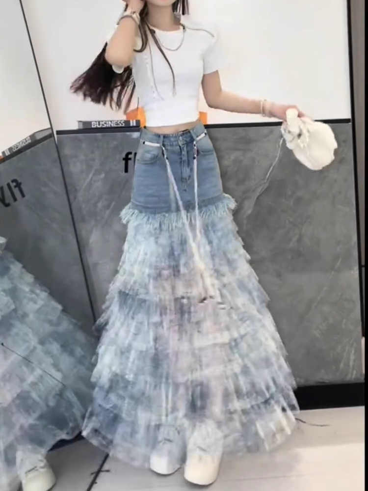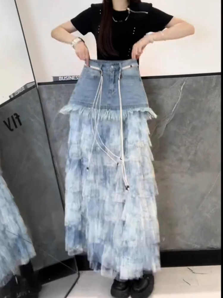 BY16824# 时尚牛仔夏季洋气扎染蛋糕a裙百搭显瘦拼接蓝色裙新款半身裙字女