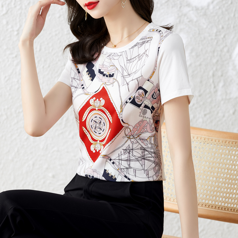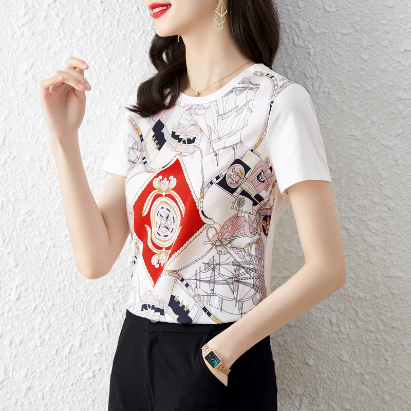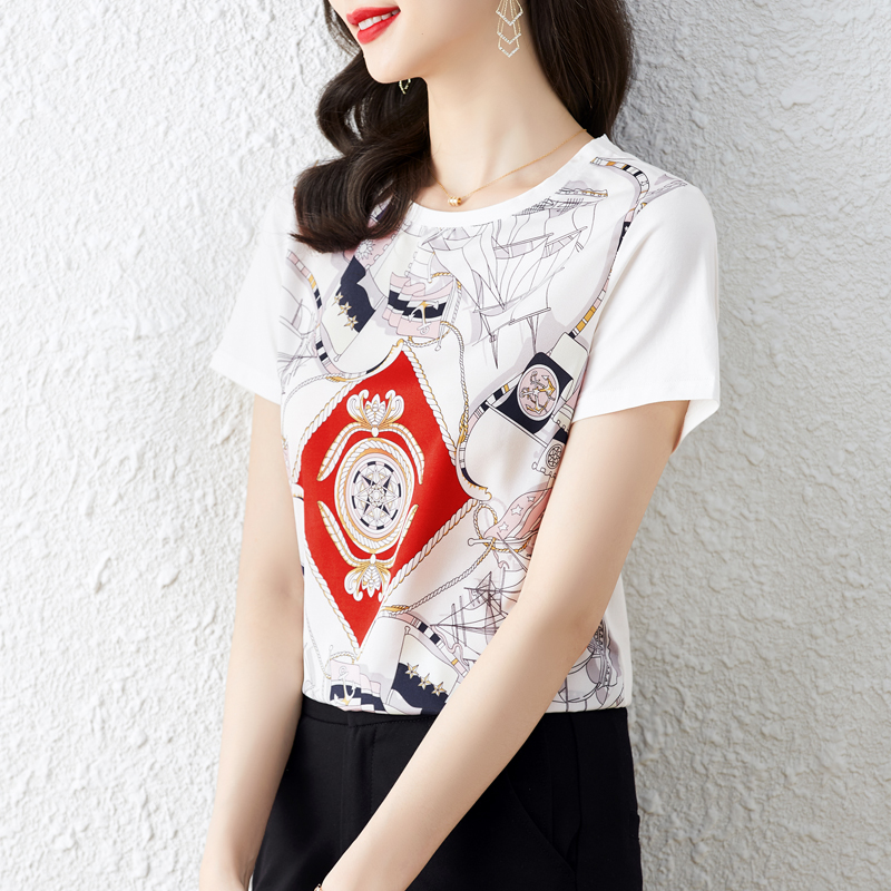 BY16994# 重磅缎面真丝新款数码印花宽松圆领韩版时尚T恤上衣 服裝批發女裝批發服飾貨源