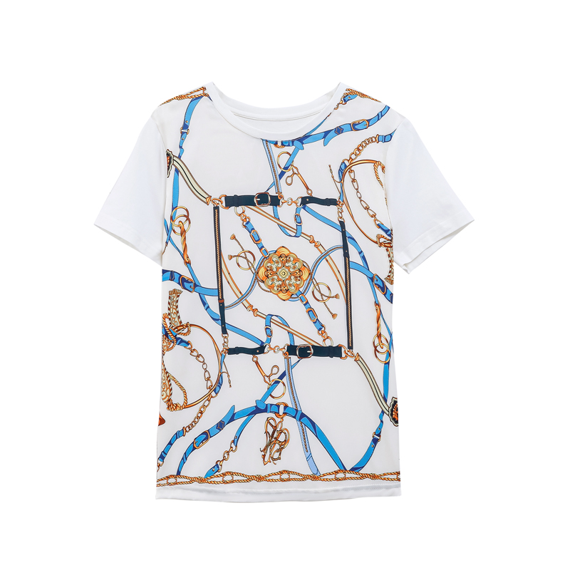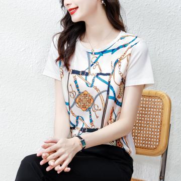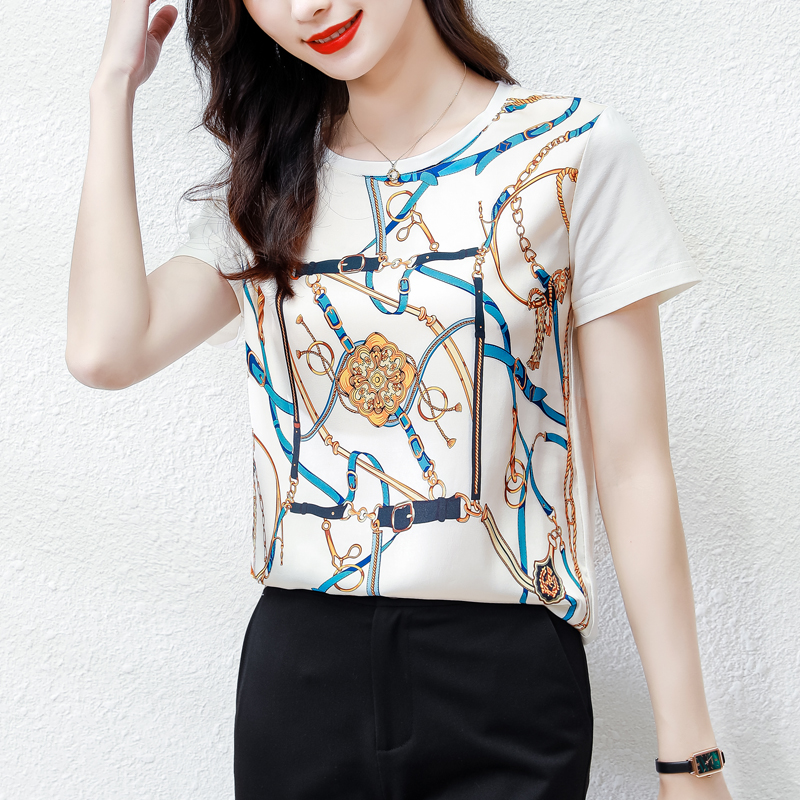 BY16996# 新款重磅真丝T恤宽松女短袖印花白色圆领小衫半袖上衣 服裝批發女裝批發服飾貨源