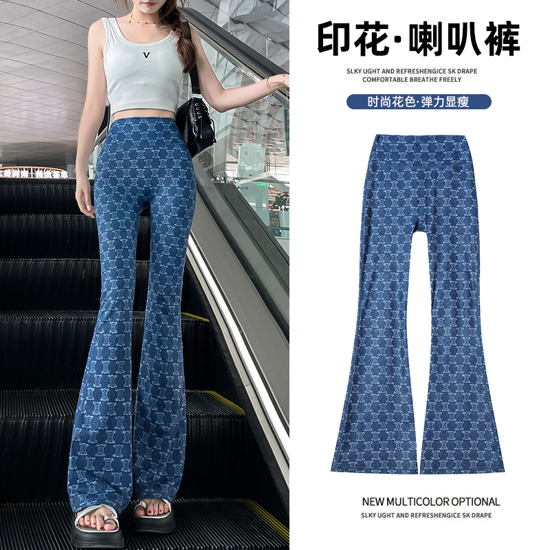 BY17002# 小个子印花仿牛仔蓝高腰提臀休闲裤运动微喇瑜伽裤喇叭牛仔裤 服裝批發女裝批發服飾貨源