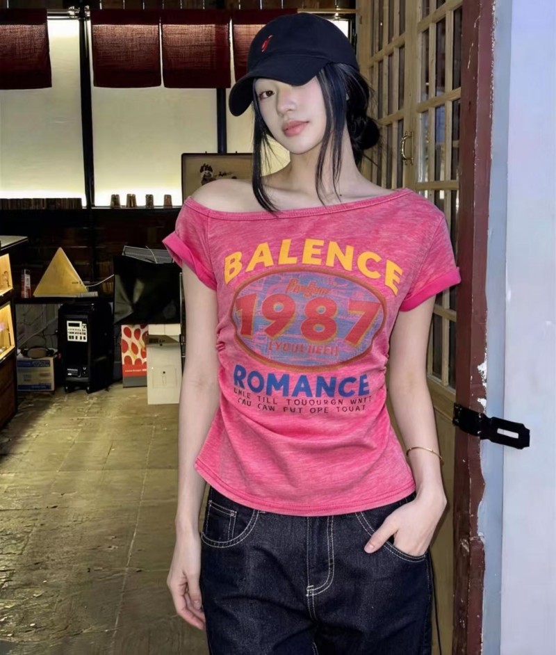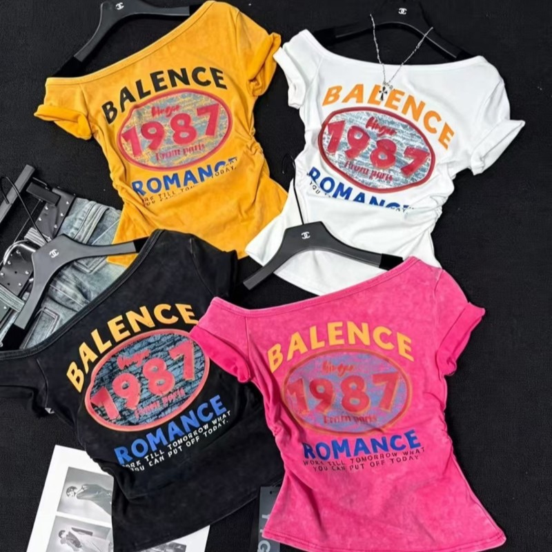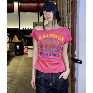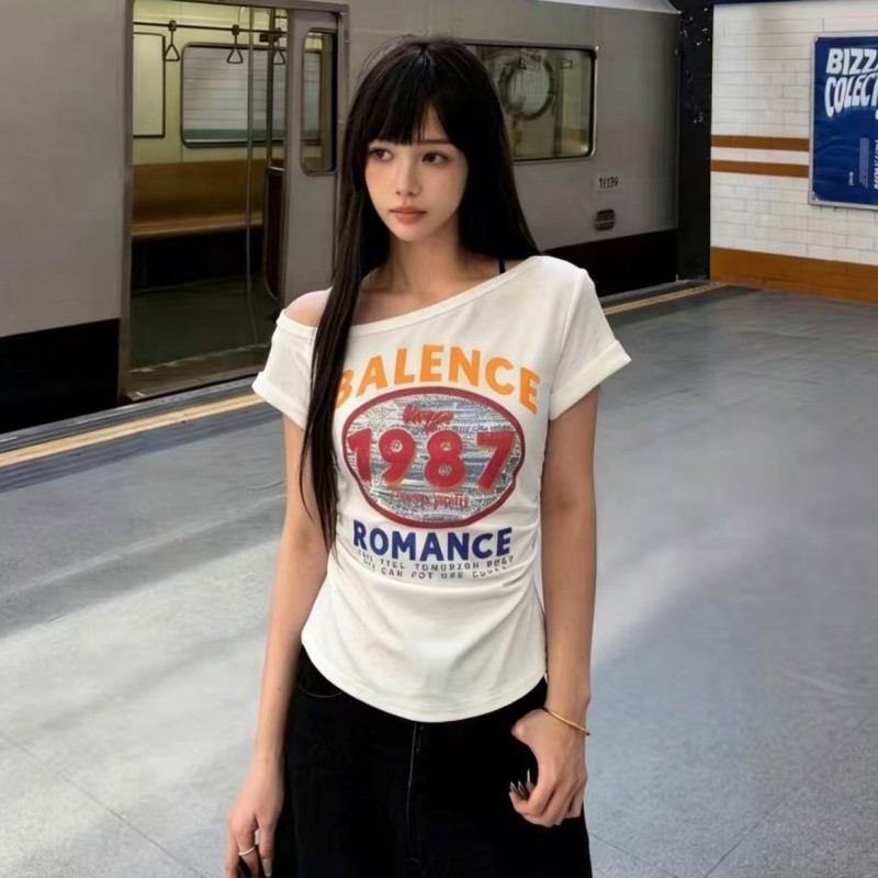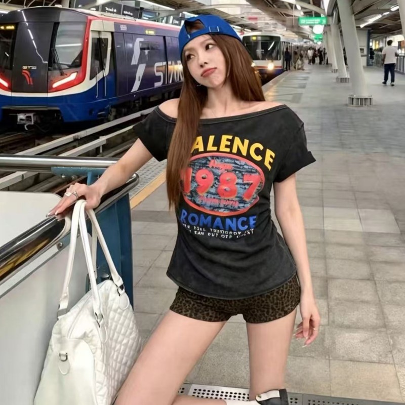 BY17012# 夏季新款韩系上衣超火超好看漂亮修身斜肩领印花短袖T恤女 服裝批發女裝批發服飾貨源