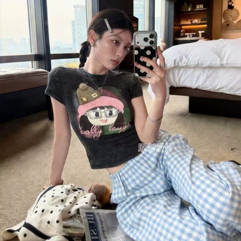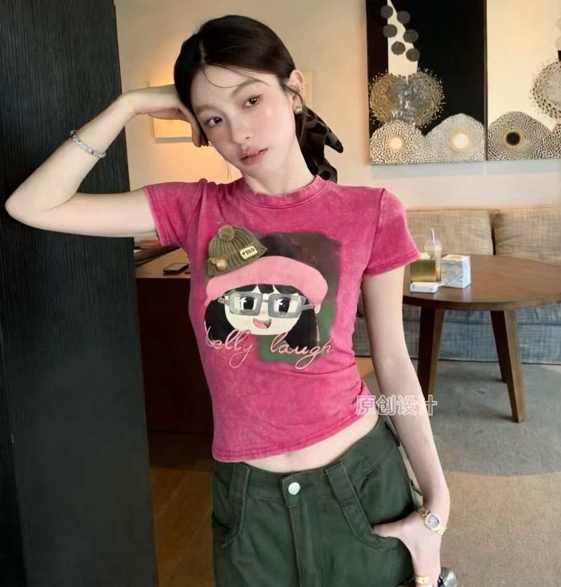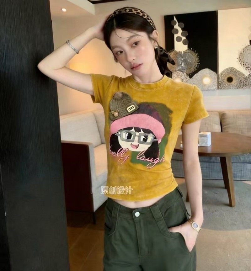 BY17014# 夏季新款韩版重工印花扎染圆领短袖T恤女修身短款洋气上衣潮 服裝批發女裝批發服飾貨源