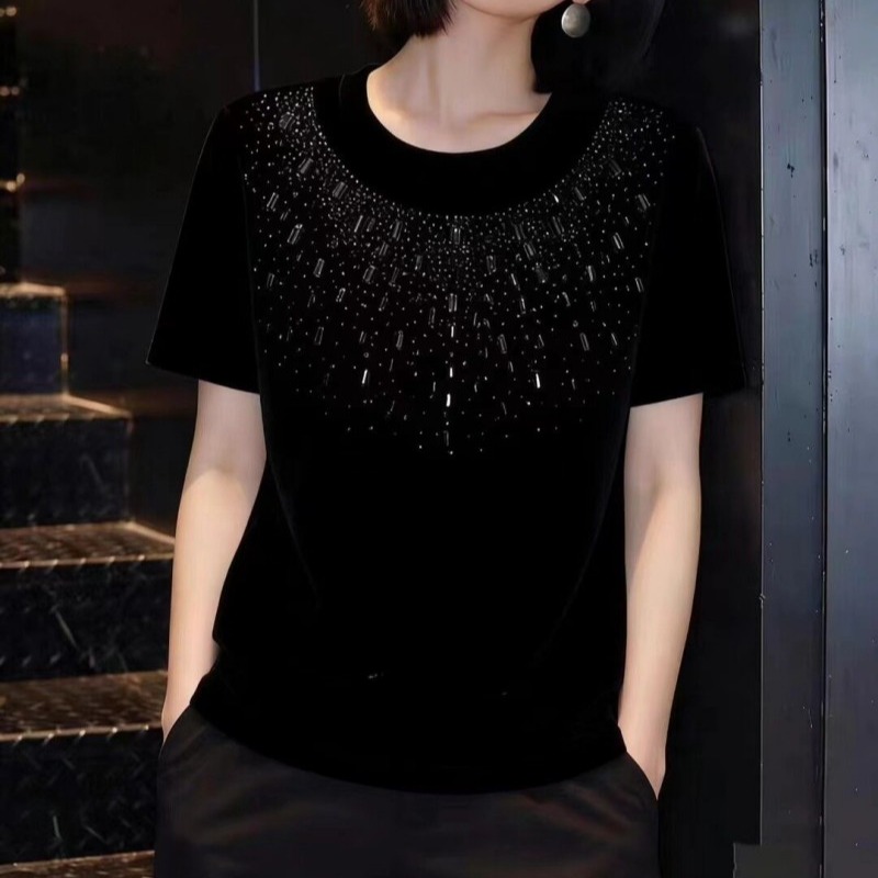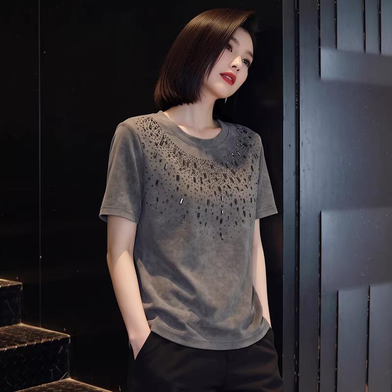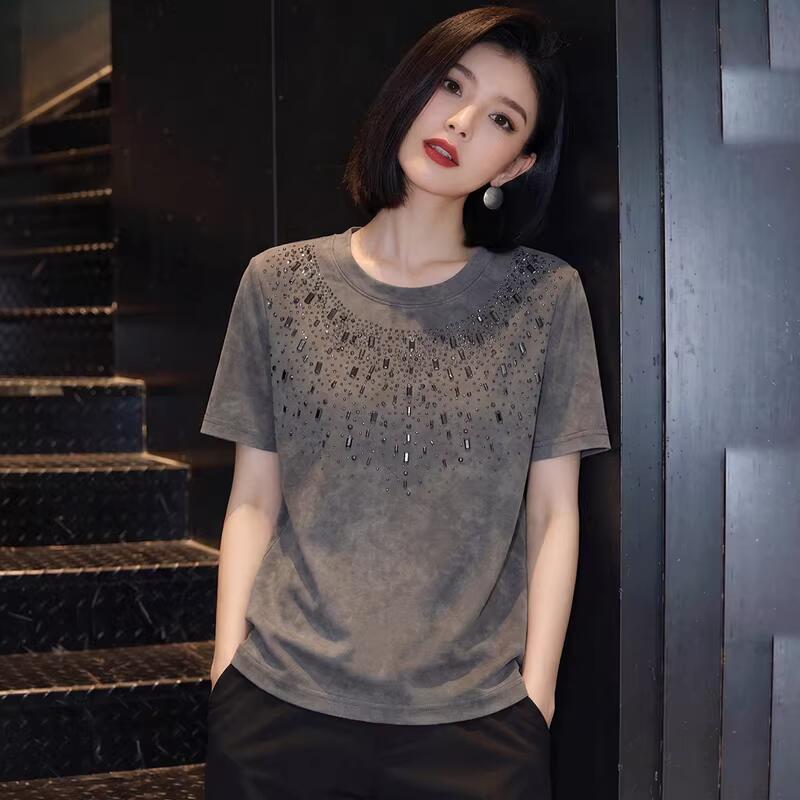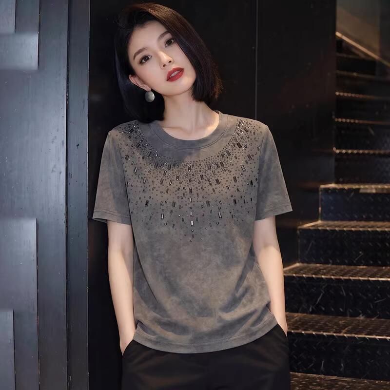 BY17015# 韩系轻奢风重工烫钻短袖T恤女夏季新款宽松显瘦圆领气质上衣 服裝批發女裝批發服飾貨源