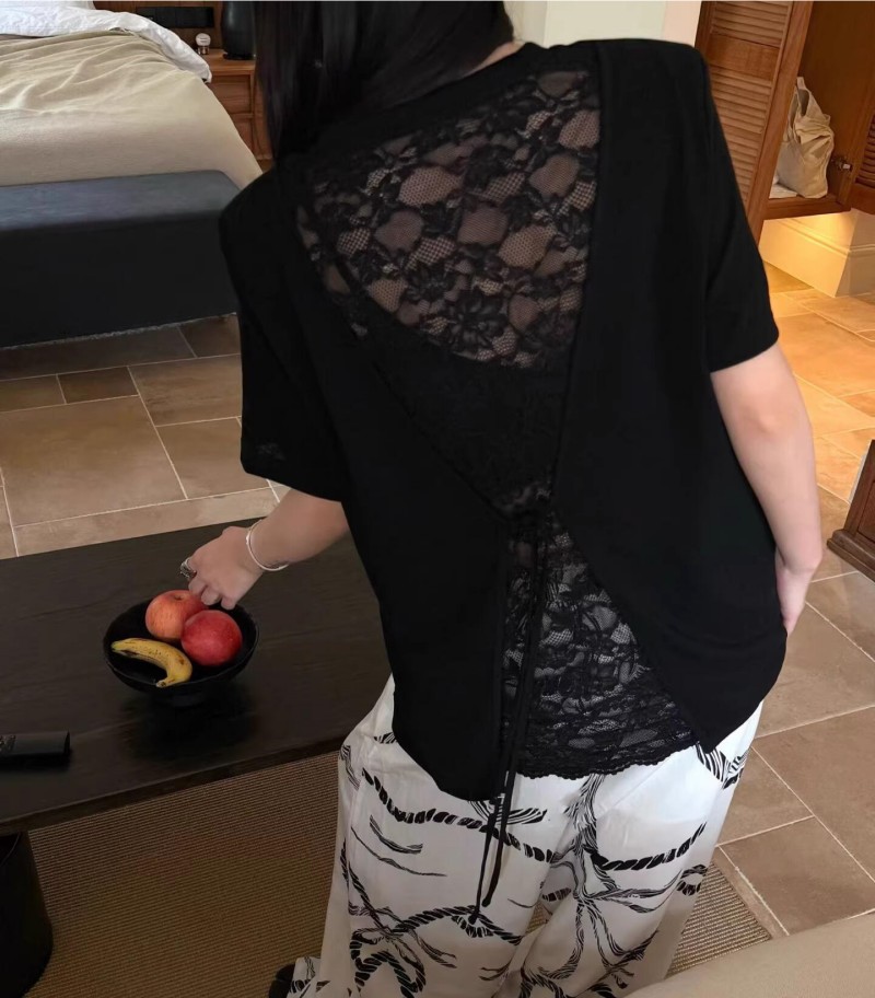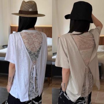 BY17017# 韩版时尚设计感假两件蕾丝拼接短袖T恤女新款休闲露背上衣潮 服裝批發女裝批發服飾貨源