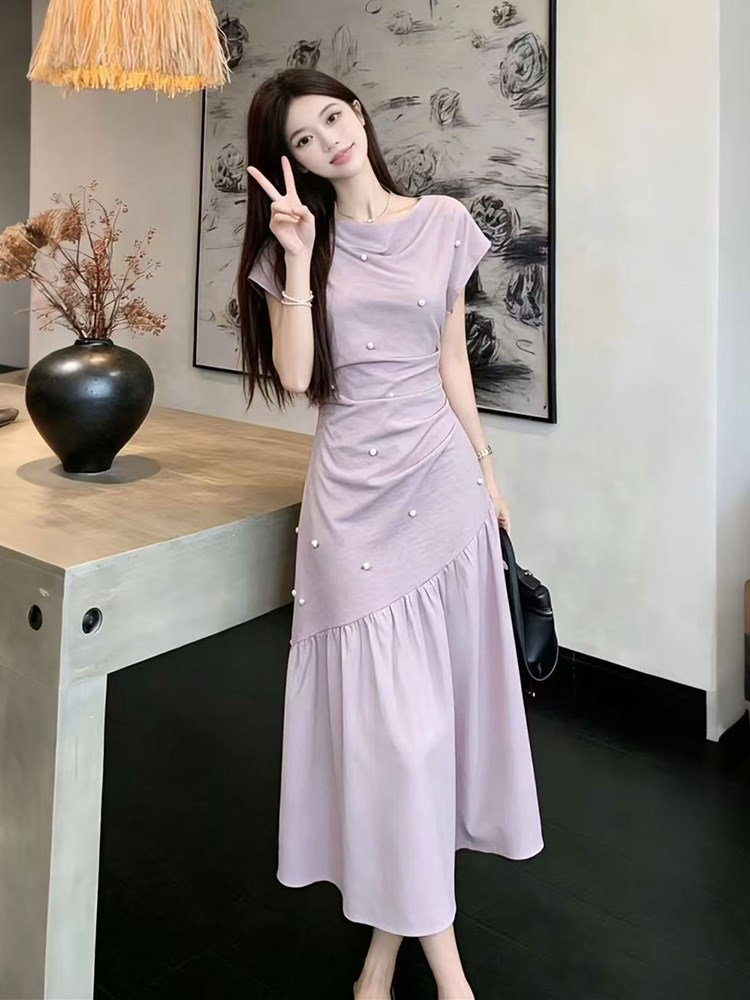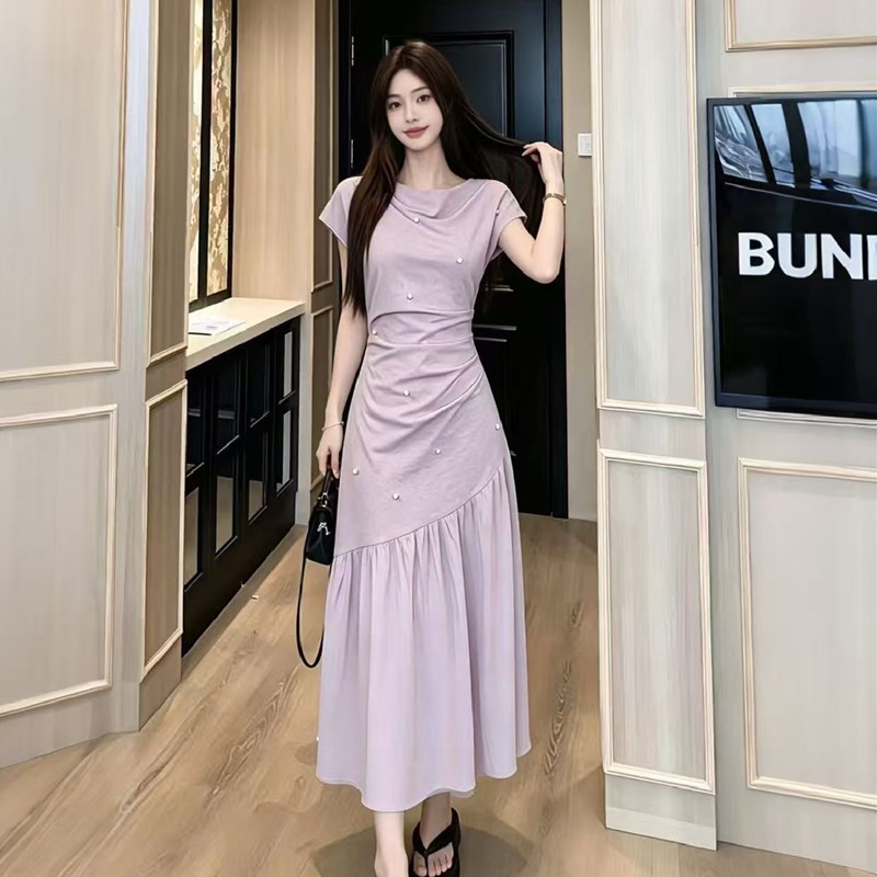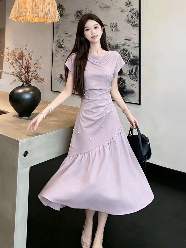 BY17022# 夏季新款胖mm设计感法式高级感荡领拼接遮肉显瘦连衣裙长裙子 服裝批發女裝批發服飾貨源