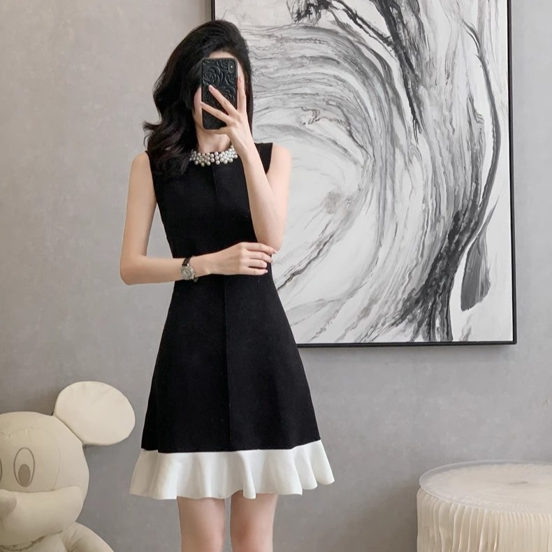 BY17030# 法式小香风撞色无袖连衣裙女夏季新款设计感收腰显瘦小黑裙女 服裝批發女裝批發服飾貨源