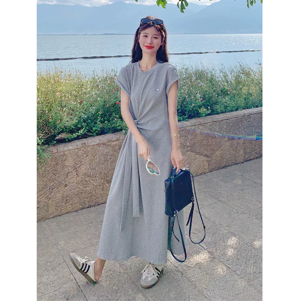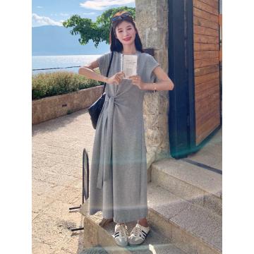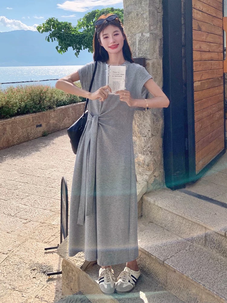 灰色小众设计感连衣裙女中长款夏季新款法式显瘦垂坠感T恤裙 服裝批發女裝批發服飾貨源