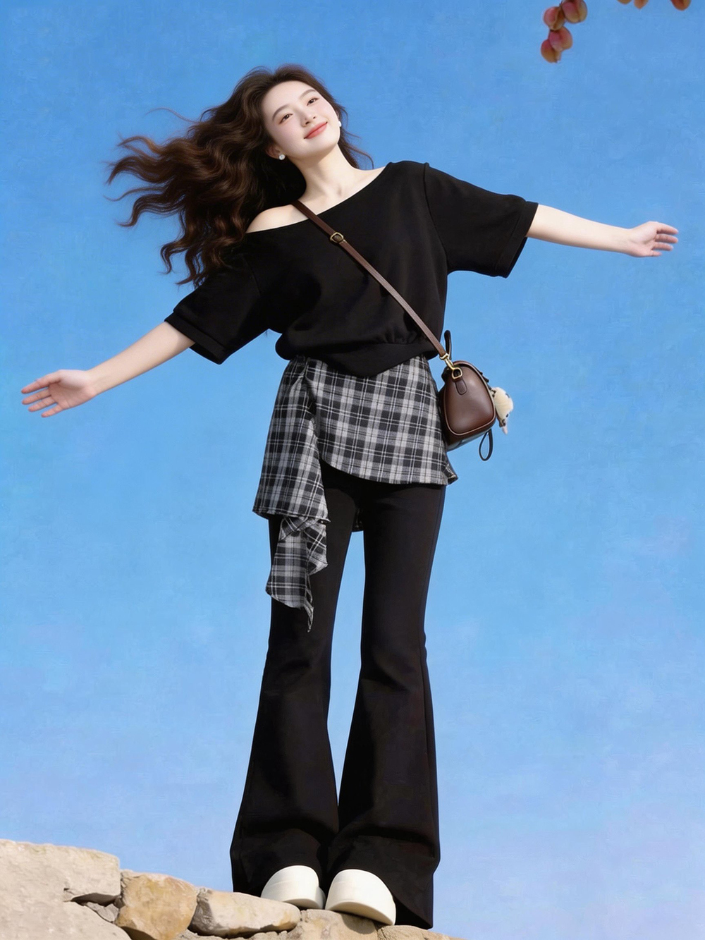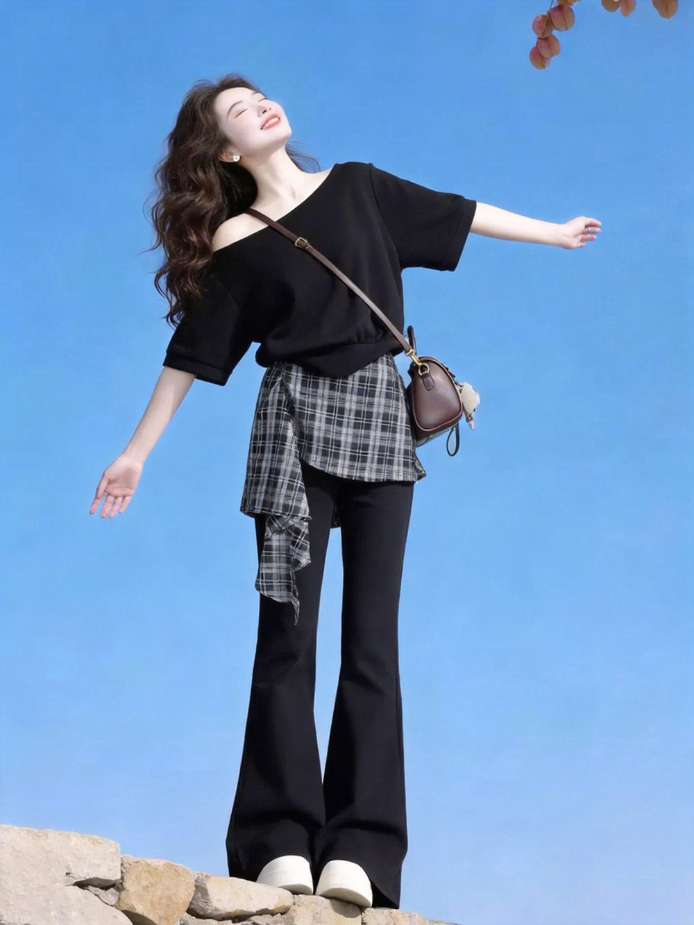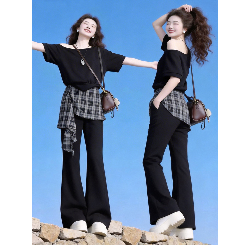 大码胖MM法式复古格纹不规则斜肩短袖女夏季新款高腰假两件微喇裤 服裝批發女裝批發服飾貨源