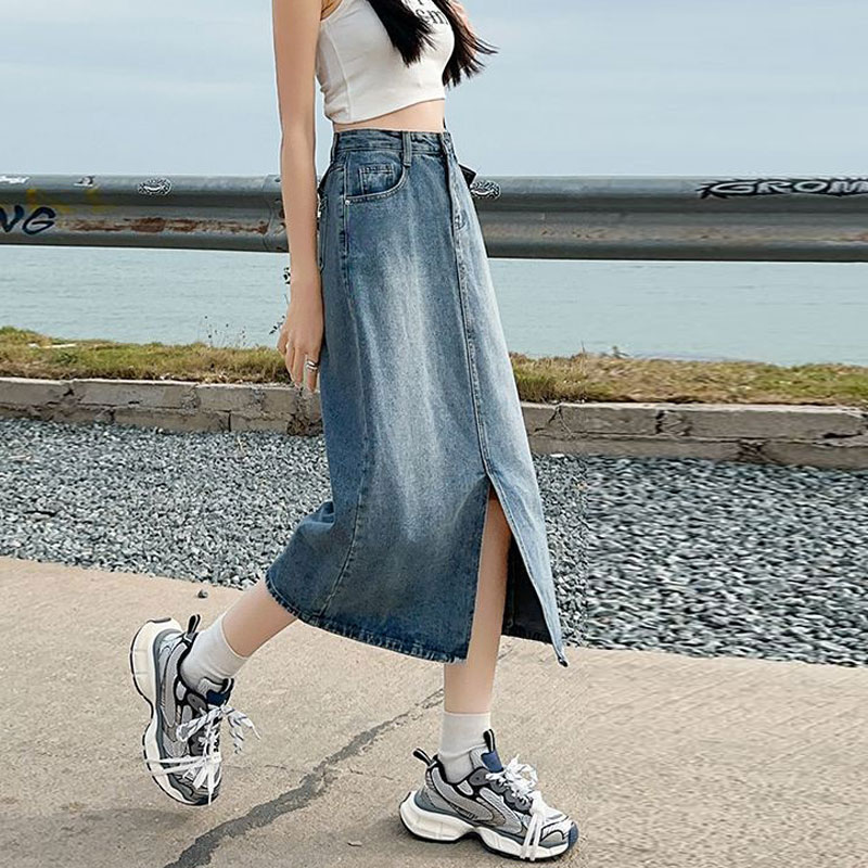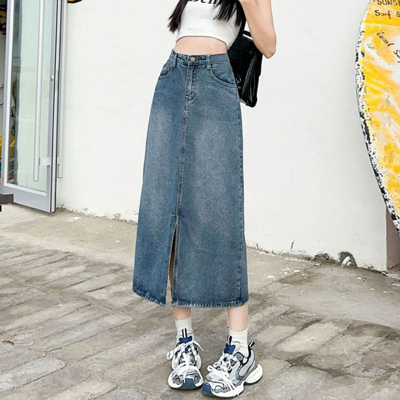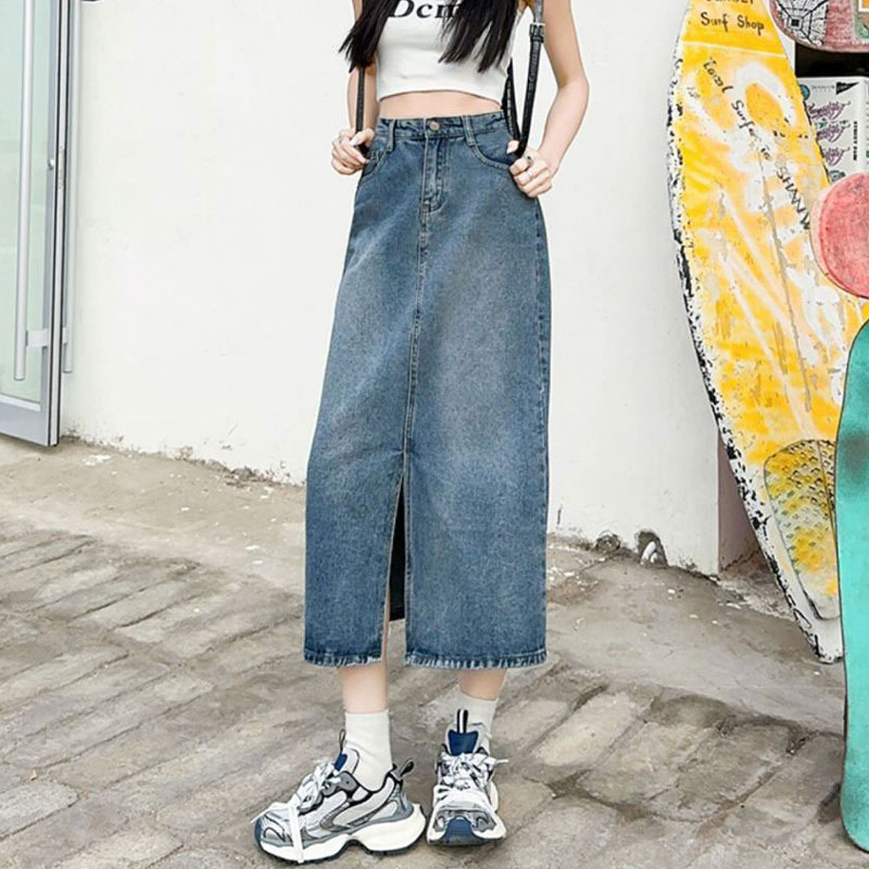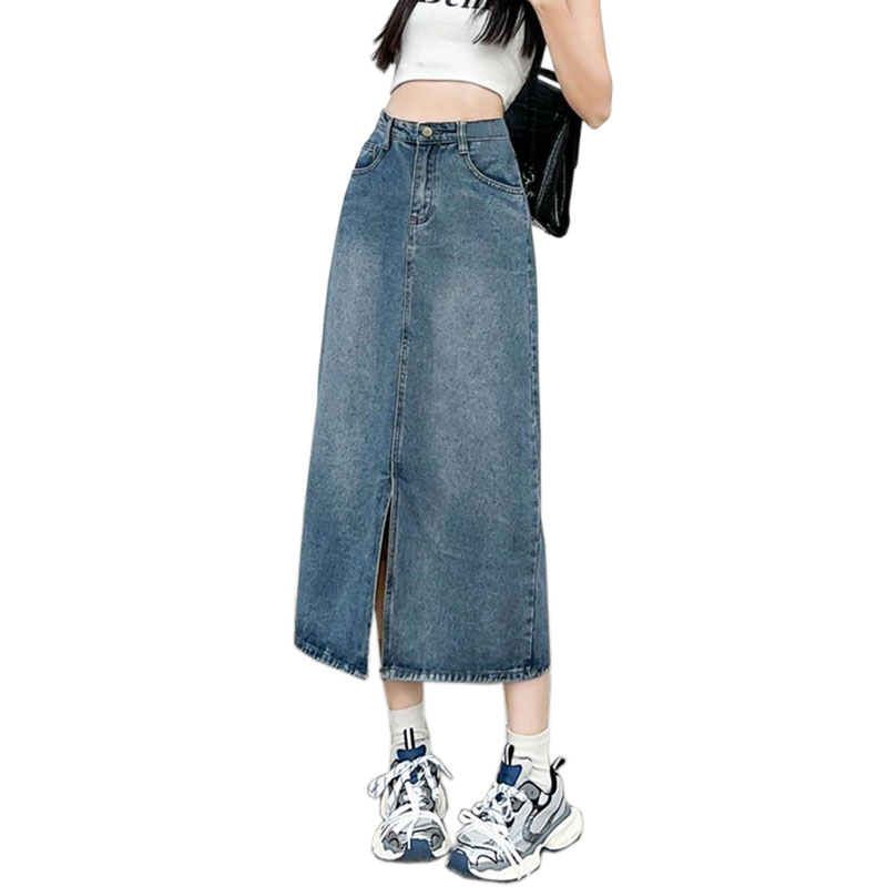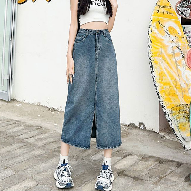 半身韩版牛仔裙女ins风设计感前开叉复古遮肉a字直筒包臀中长裙子 服裝批發女裝批發服飾貨源
