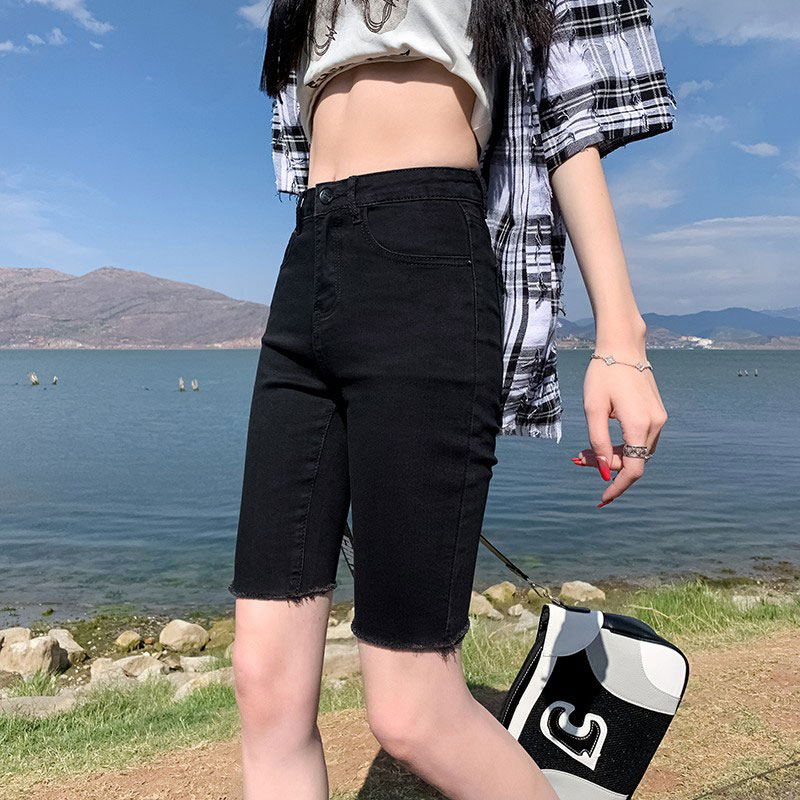 BY17143# 牛仔短裤女黑色薄款夏小个子百搭修身弹力直筒骑行中裤外穿五分裤 服裝批發女裝批發服飾貨源