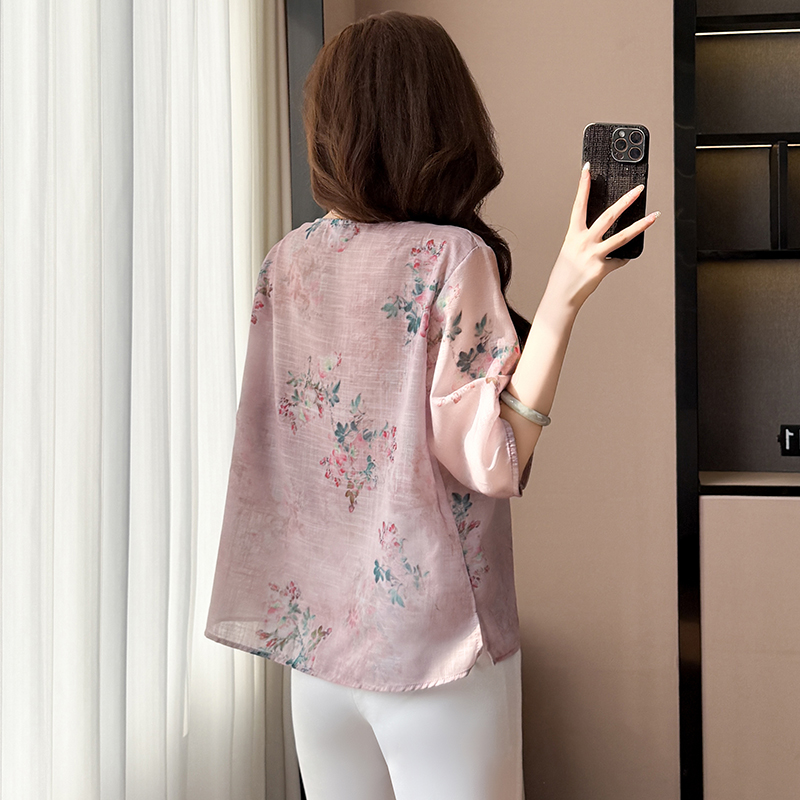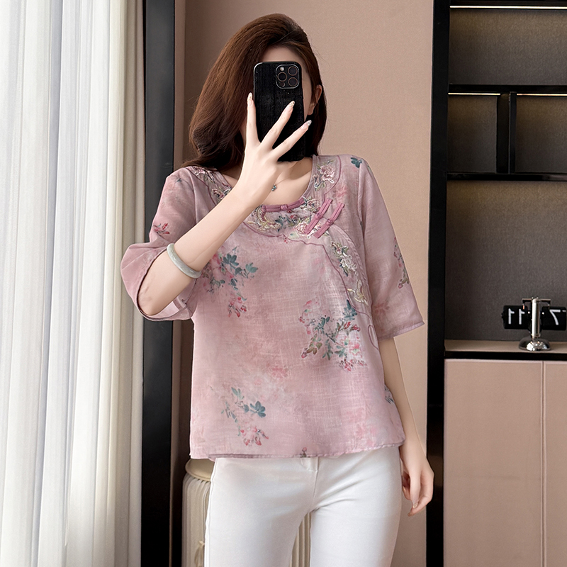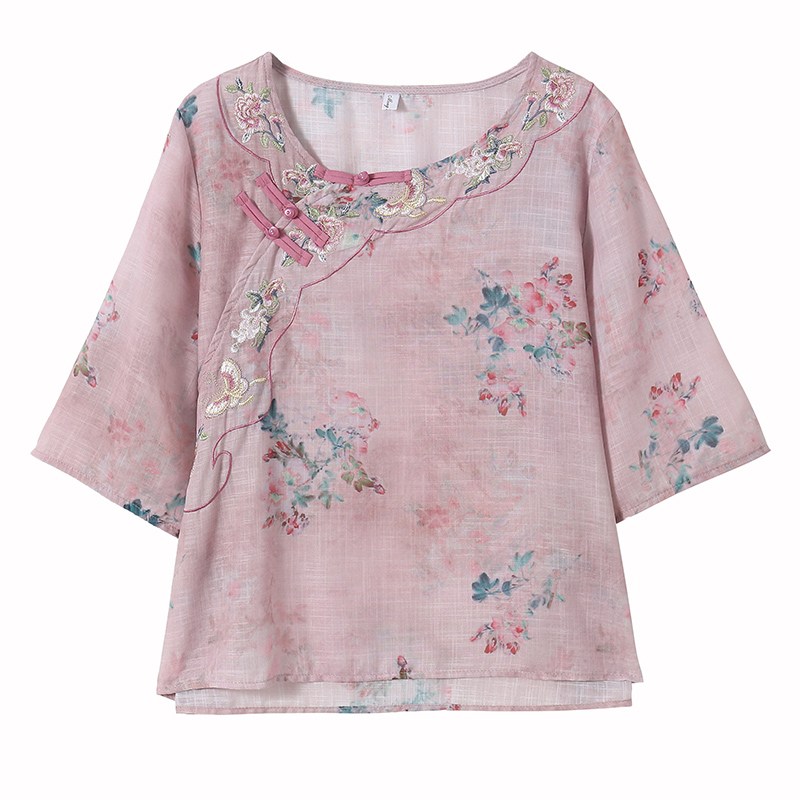 BY17290# 棉麻大码女装宽松显瘦T恤衫衬衫五分袖印花绣花时尚上衣夏季新款
