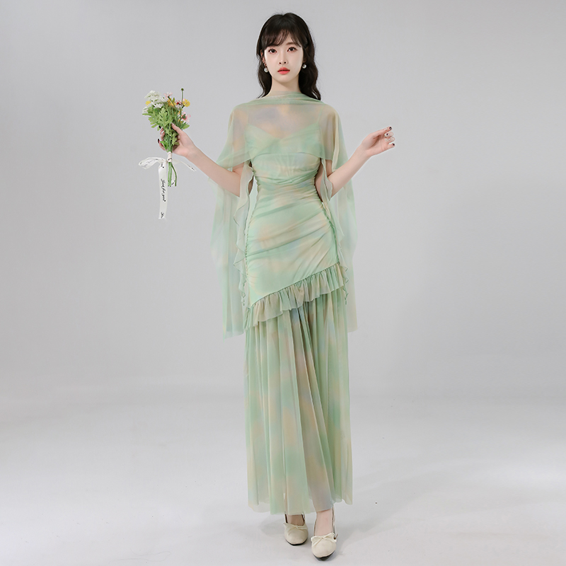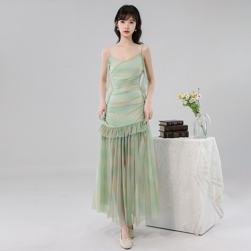 BY17440# 法式网纱吊带连衣裙女夏季新款爆款高级感收腰度假长裙 服裝批發女裝批發服飾貨源