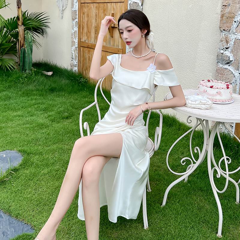 BY17446# 法式吊带裙新款气质轻奢修身显瘦高级设计荷叶边一字肩连衣裙 服裝批發女裝批發服飾貨源